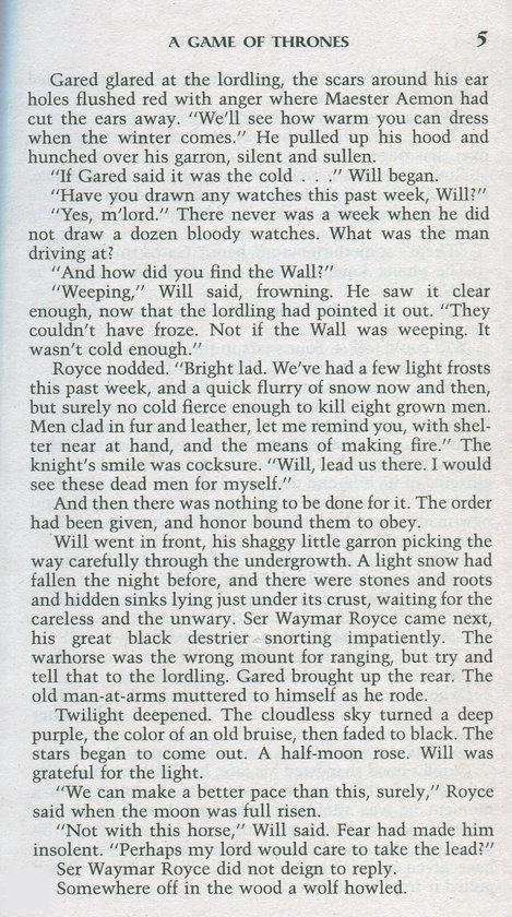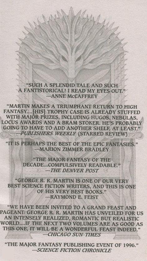 An ancient cataclysm has thrown the seasons into disarray, and the royal house of Starks is thrust into the center of the conflict, in a tale of lords and ladies, soldiers and sorcerers, assassins and saviors, and the game of thrones. Reprint.