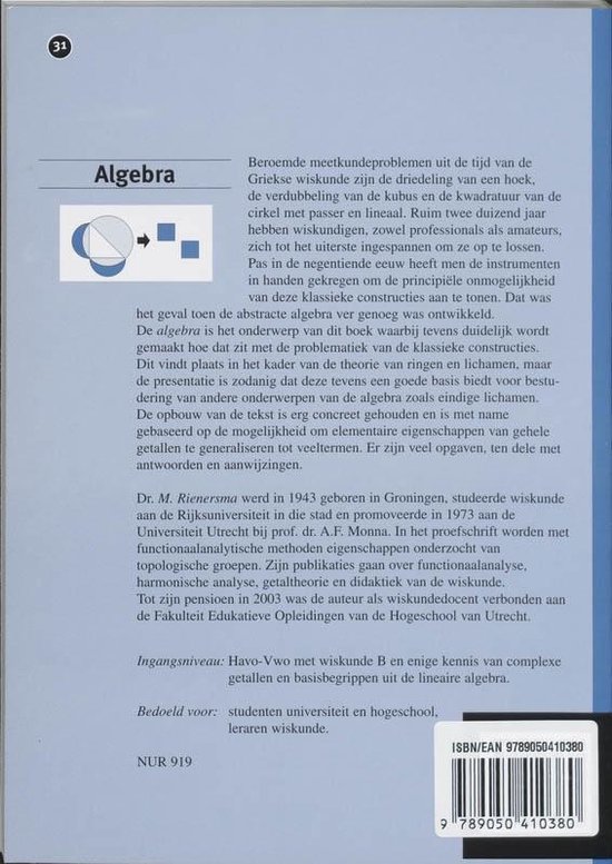 Beroemde meetkundeproblemen uit de tijd van de Griekse wiskunde zijn de driedeling van een hoek, de verdubbeling van de kubus en de kwadratuur van de cirkel met passer en liniaal. Ruim twee duizend jaar hebben wiskundigen, zowel professionals als amateurs, zich tot het uiterste ingespannen om ze op te lossen. Pas in de negentiende eeuw heeft men de instrumenten in handen gekregen om de principiële onmogelijkheid van deze klassieke constructies aan te tonen. Dat was het geval toen de abstracte algebra ver genoeg was ontwikkeld. De algebra is het onderwerp van dit boek waarbij tevens duidelijk wordt gemaakt hoe dat zit met de problematiek van de klassieke constructies. Dit vindt plaats in het kader van de theorie van ringen en lichamen, maar de presentatie is zodanig dat deze tevens een goede basis biedt voor bestudering van andere onderwerpen van de algebra zoals eindige lichamen. De opbouw van de tekst is erg concreet gehouden en is met name gebaseerd op de mogelijkheid om elementaire eigenschappen van gehele getallen te generaliseren tot veeltermen. Er zijn veel opgaven, ten dele met antwoorden en aanwijzingen.