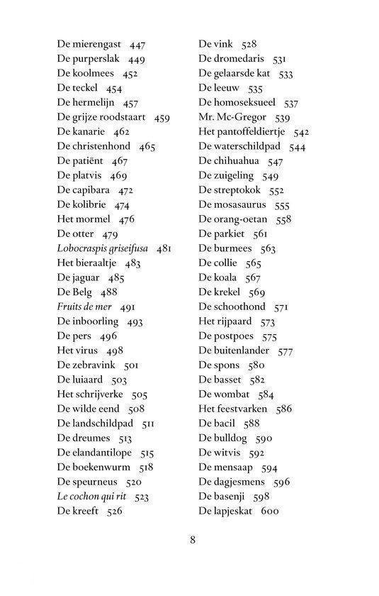 Het boek bevat een grote verzameling essays en observaties over uiteenlopende diersoorten. Daarbij komen onderwerpen aan bod zoals evolutie, gedrag, voortplanting en de manier waarop mensen dieren gebruiken of idealiseren. Dekkers laat zien dat onze kijk op dieren vaak meer zegt over de mens dan over het dier zelf.