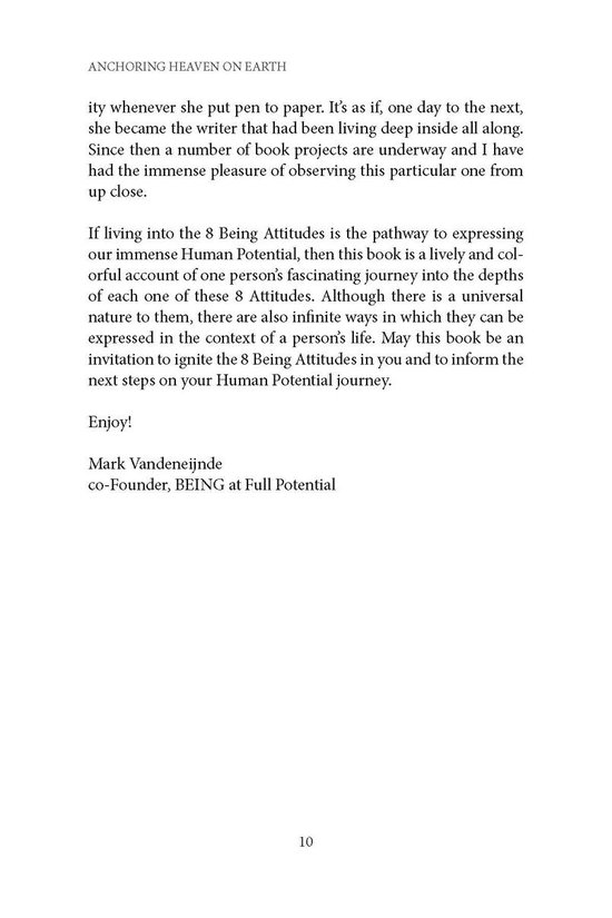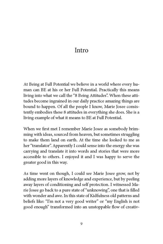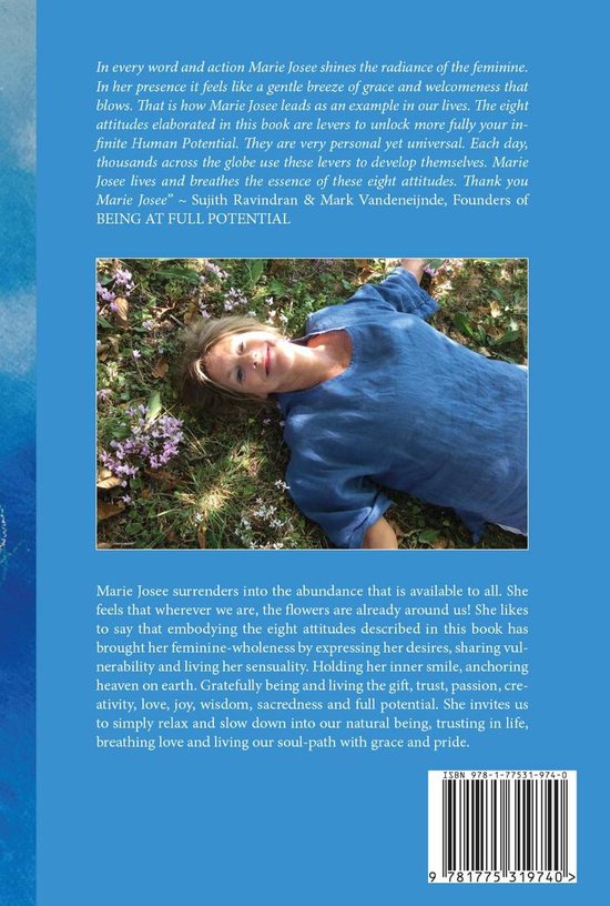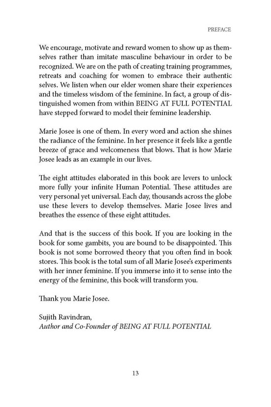 In every word and action Marie Josee shines the radiance of the feminine. In her presence it feels like a gentle breeze of grace and welcomeness that blows. That is how Marie Josee leads as an example in our lives. The eight attitudes elaborated in this book are levers to unlock more fully your infinite Human Potential. They are very personal yet universal. Each day, thousands across the globe use these levers to develop themselves. Marie Josee lives and breathes the essence of these eight attitudes. Thank you Marie Josee” ~ Sujith Ravindran & Mark Vandeneijnde, Founders of BEING AT FULL POTENTIAL
