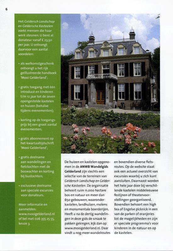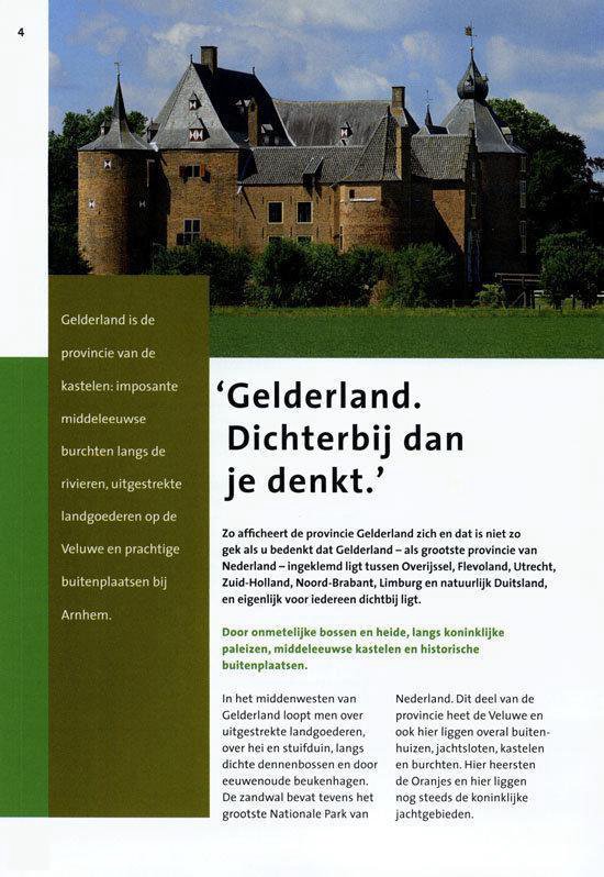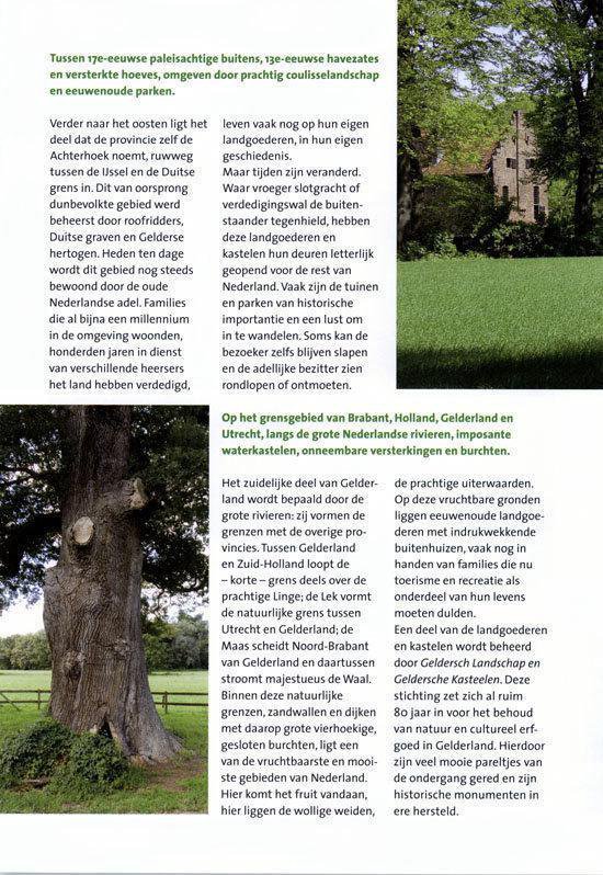 Een selectie van zeven kastelen die opengesteld zijn voor publiek maar ook particuliere buitenhuizen, Koninklijke paleizen en andere landhuizen worden uitvoerig beschreven. De veelzijdigheid van het Gelderse landschap komt goed tot uiting.