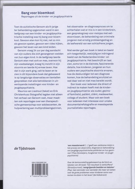 Toen de autistische Gersom als 8-jarige ter behandeling opgenomen werd in een leefgroep van een kinder- en jeugdpsychiatrische instelling was hij bang voor bloemkool. Gewoon eten kon hij niet, net zo min als gewoon spelen, gewoon een video kijken, gewoon het leven van een kind leiden. Gersom vroeg 24 uur per dag aandacht van zijn ouders die zich gevangenen voelden van hun eigen kind. In de leefgroep leerde Gersom eten met vork en mes, overwon hij zijn voedselangst, kreeg hij inzicht in zijn stoornis en leerde hij ermee leven. Hoe dat in zijn werk ging, valt te lezen en te zien in dit bijzondere boek dat gebaseerd is op langdurige observaties en tientallen gesprekken met alle betrokkenen in uiteenlopende instellingen voor kinderen jeugdspsychiatrie.