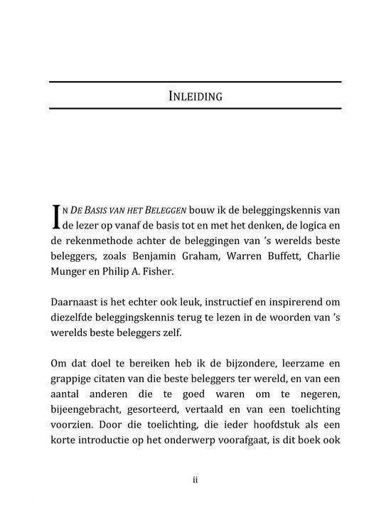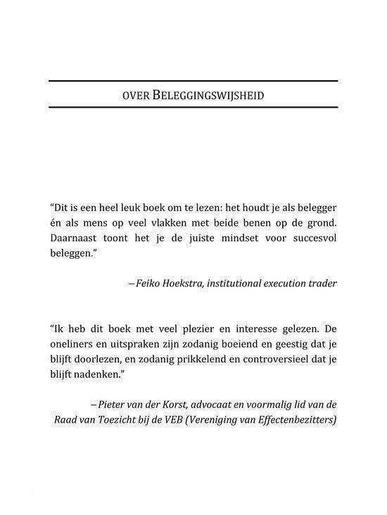 In acht hoofdstukken, ieder voorzien van een heldere inleiding, neemt BELEGGINGSWIJSHEID u mee in de ervaringen, inzichten, en fouten van de de beste beleggers ter wereld (waaronder de wereldberoemde beleggers Warren Buffett, George Soros, Carlos Slim, Peter Lynch, John Templeton en vele anderen). Zo biedt BELEGGINGSWIJSHEID u een scherpe, leerzame, en heldere blik op de basisbeginselen van verstandig en succesvol beleggen.