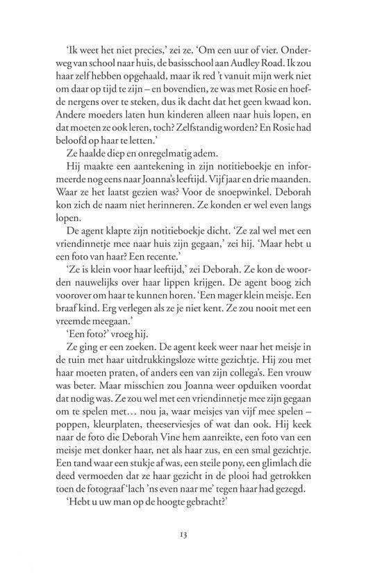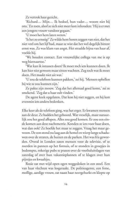 Frieda Klein is psychoanalytica. Ze leeft een strak georganiseerd leven, dat vooral gericht is op het helpen van anderen. Niet alleen haar patiënten, maar ook haar familie en vrienden kunnen altijd op haar rekenen. De onrust in haar hoofd probeert ze te verdrijven met lange nachtelijke wandelingen door haar geliefde Londen. Frieda is ervan overtuigd dat wat zich in het hoofd van haar patiënten afspeelt controleerbaar is. Maar als een van haar patiënten vertelt dat hij ervan droomt een kind te hebben, met rood haar en sproeten, en kort daarna een jongetje verdwijnt dat aan die omschrijving voldoet, wordt Frieda geconfronteerd met de onbeheersbare werkelijkheid die zij altijd angstvallig buiten de deur heeft weten te houden. Kan Frieda¿s kennis van de menselijke geest de recherche helpen bij het vinden van het jongetje? Is er een verband met een ontvoeringszaak van tweeëntwintig jaar eerder? En zal de dader worden ontmaskerd?