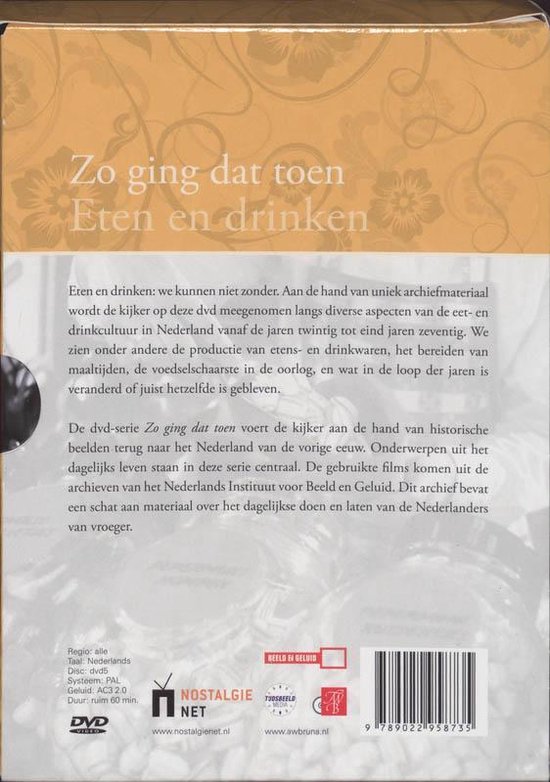 Eten en drinken: we kunnen niet zonder. Aan de hand van uniek archiefmateriaal wordt de kijker in vogelvlucht meegenomen langs diverse aspecten van de eet- en drinkcultuur in Nederland vanaf de jaren twintig tot eind jaren zeventig. We zien onder andere de productie van etens- en drinkwaren, het bereiden van maaltijden, de voedselschaarste in de oorlog, en wat in de loop der jaren is veranderd en hetzelfde is gebleven.