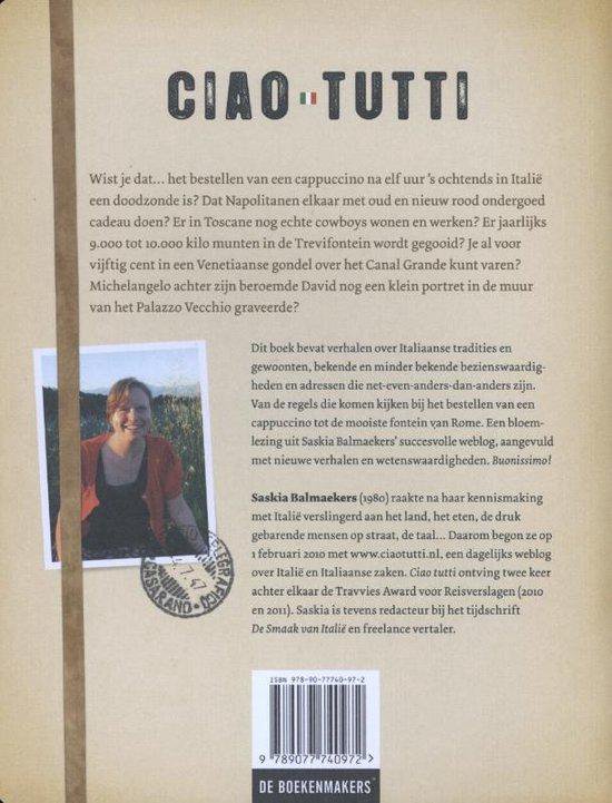 Ciao tutti. Een ontdekkingsblog door Italië. Wist je dat het bestellen van een cappuccino na elf uur ’s ochtends in Italië een doodzonde is? Dat Napolitanen elkaar met oud en nieuw rood ondergoed cadeau doen? Dit boek bevat verhalen over Italiaanse tradities en gewoonten, bekende en minder bekende bezienswaardigheden en adressen die net-even-anders-dananders zijn. Van de regels die komen kijken bij het bestellen van een cappuccino tot de mooiste fontein van Rome. Een bloemlezing uit Saskia Balmaekers’ succesvolle weblog, aangevuld met nieuwe verhalen en wetenswaardigheden. Buonissimo!Saskia Balmaekers (1980) raakte na haar kennismaking met Italië verslingerd aan het land, het eten, de druk gebarende mensen op straat, de taal… Daarom begon ze op 1 februari 2010 met Ciao Tutti, een dagelijks weblog over Italië en Italiaanse zaken. Ciao Tutti ontving twee keer achter elkaar de Travvies Award voor Reisverslagen (2010 en 2011). Saskia is redacteur bij het tijdschrift De Smaak van Italië.