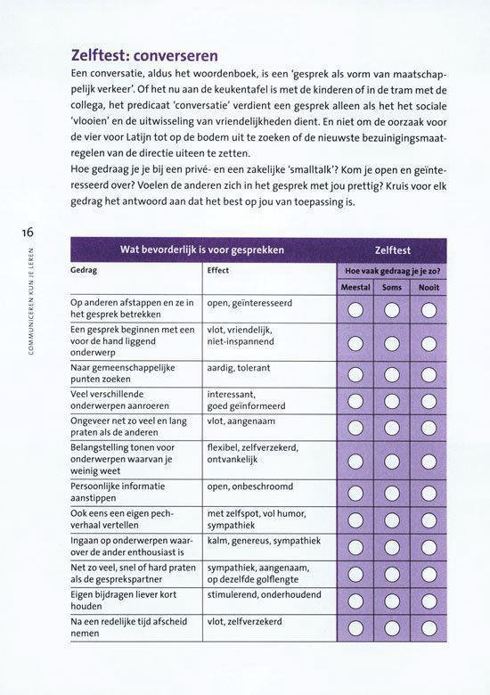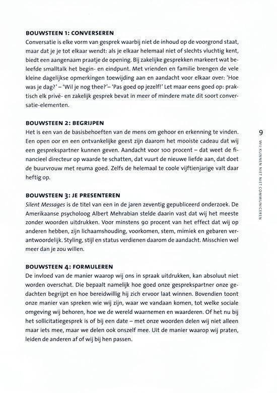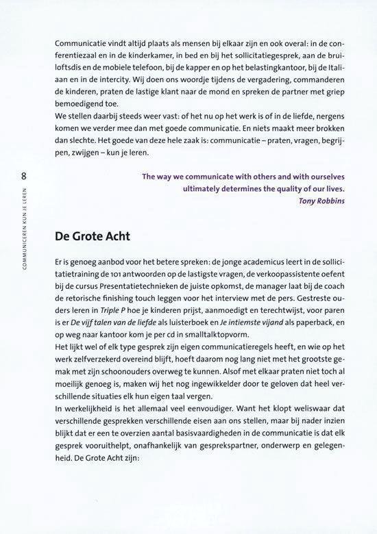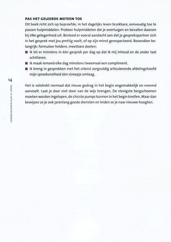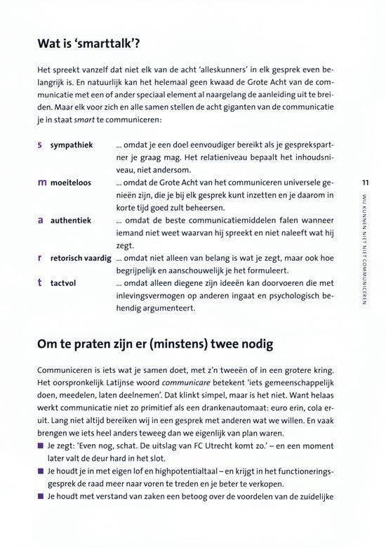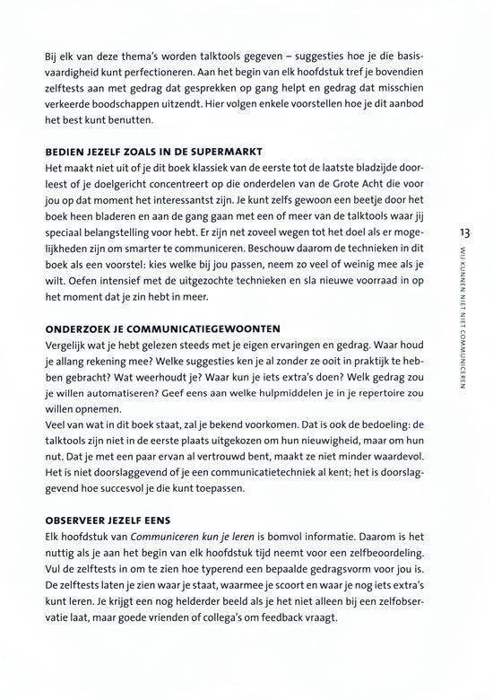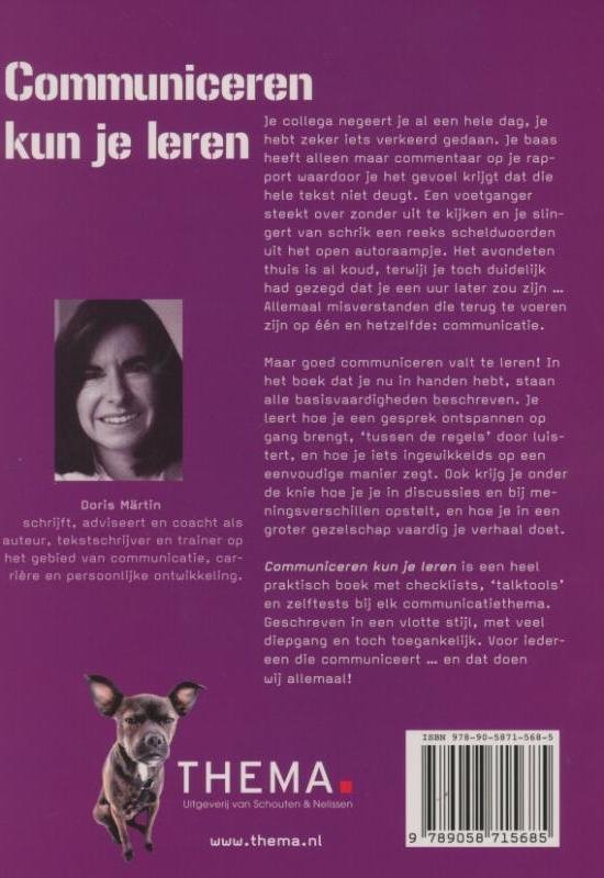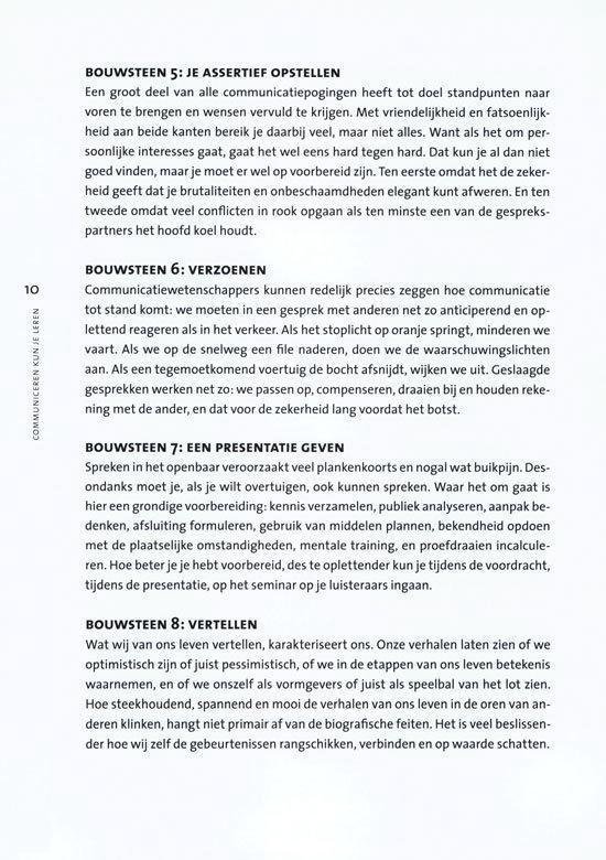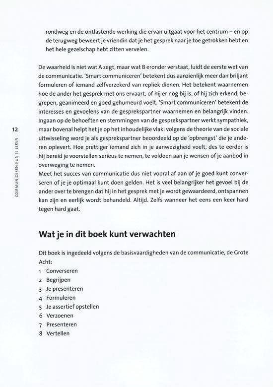 Je collega negeert je al de hele dag, je hebt zeker iets verkeerd gedaan. Een voetganger steekt over zonder uit te kijken en je slingert van schrik een reeks scheldwoorden uit het open autoraampje. Het avondeten thuis is al koud, terwijl je toch duidelijk had gezegd dat je een uur later zou zijn… Allemaal misverstanden die terug te voeren zijn op één en hetzelfde: communicatie. Maar goed communiceren valt te leren! In Communiceren kun je leren staan alle basisvaardigheden beschreven. Je leert hoe je een gesprek ontspannen op gang brengt, ’tussen de regels’ door luistert, hoe je iets ingewikkelds op een eenvoudige manier zegt. Ook krijg je onder de knie hoe je je in discussies en bij meningsverschillen het beste opstelt, en hoe je in een groter gezelschap vaardig je verhaal doet. Communiceren kun je leren is een heel praktisch boek met checklists, ’talktools’ en zelftests bij elk communicatiethema. Geschreven in een vlotte stijl, met veel diepgang en toch toegankelijk. Voor iedereen die communiceert … en dat zijn wij dus allemaal!