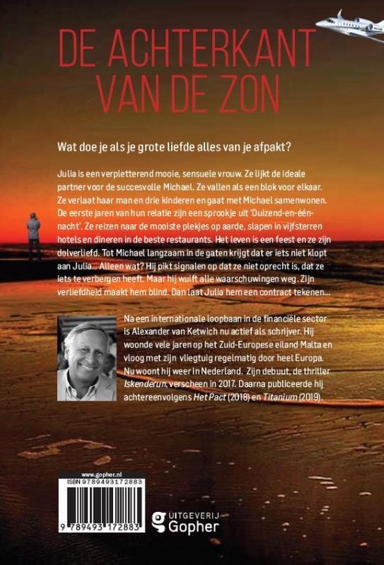 Wat doe je als je grote liefde alles van je afpakt? Julia is een verpletterend mooie, sensuele vrouw. Ze lijkt de ideale partner voor de succesvolle Michael. Ze vallen als een blok voor elkaar. Ze verlaat haar man en drie kinderen en gaat met Michael samenwonen. De eerste jaren van hun relatie zijn een sprookje uit ‘Duizend-en-éénnacht’. Ze reizen naar de mooiste plekjes op aarde, slapen in vijfsterren hotels en dineren in de beste restaurants. Het leven is een feest en ze zijn dolverliefd. Tot Michael langzaam in de gaten krijgt dat er iets niet klopt aan Julia… Alleen wat? Hij pikt signalen op dat ze niet oprecht is, dat ze iets te verbergen heeft. Maar hij wuift alle waarschuwingen weg. Zijn verliefdheid maakt hem blind. Dan laat Julia hem een contract tekenen… Na een internationale loopbaan in de financiële sector is Alexander van Ketwich nu actief als schrijver. Hij woonde vele jaren op het Zuid-Europese eiland Malta en vloog met zijn vliegtuig regelmatig door heel Europa. Nu woont hij weer in Nederland. Zijn debuut, de thriller Iskenderun, verscheen in 2017. Daarna publiceerde hij achtereenvolgens Het Pact (2018) en Titanium (2019).