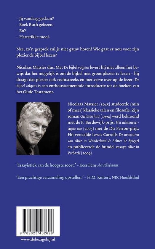 Jij vandaag gedaan? Boek Ruth gelezen. En? Hartstikkemooi.Nee, zo n gesprek zul je niet gauw horen! Wie gaat er nou voor zijn plezier de bijbel lezen?NicolaasMatsier dus. Met De bijbel volgens levert hij niet alleen het bewijs dat het mogelijk is om de bijbel met groot plezier te lezen hij draagt dat plezier ook rechtstreeks en met verve over op de lezer. De bijbel volgens is een enthousiasmerende introductie tot de boeken van het OudeTestament.