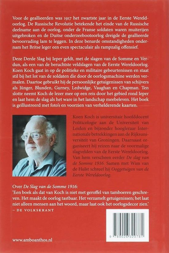 Deze Derde Slag bij Ieper geldt, met de slagen van de Somme en Verdun, als een van de beruchtste veldslagen van de Eerste Wereldoorlog. Koen Koch gaat in op de Politieke en militaire gebeurtenissen en staat stil bij het lot van de soldaten die door de oorlogsmachine werden vermalen. Daartoe gebruikt hij de persoonlijke getuigenissen van schijvers als Jünger, Blunden, Gurney, Ledwidge,Vaughan en Chapman, Ten slotte neemt Koch de lezer mee op een reis door het gebied rond Ieper en laat hem de slag als het ware in het ;landschap meebeleven. Het boek os geïllusreerd met foto’s en voorzien van verhelderende kaarten.