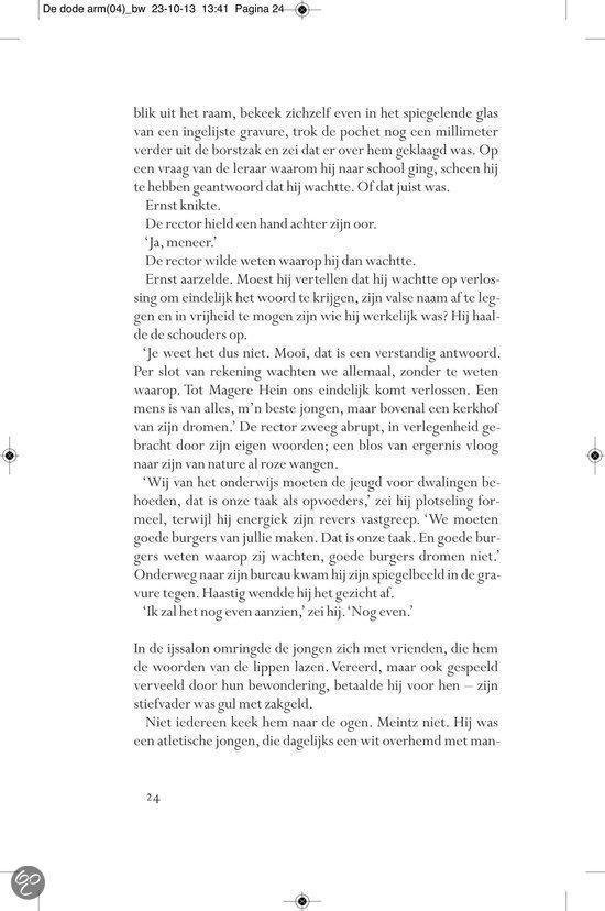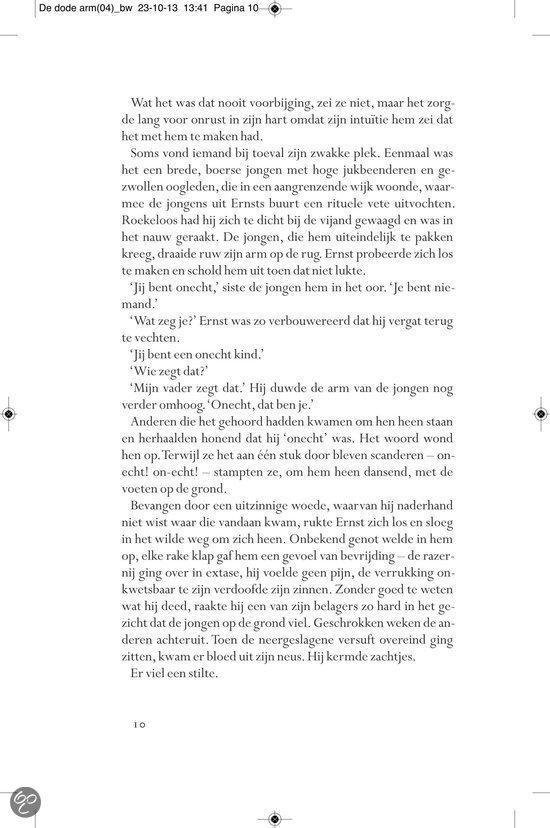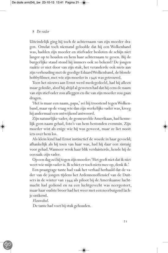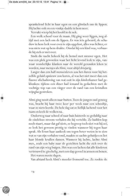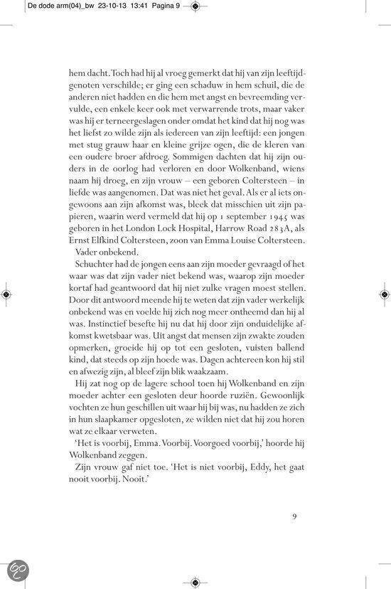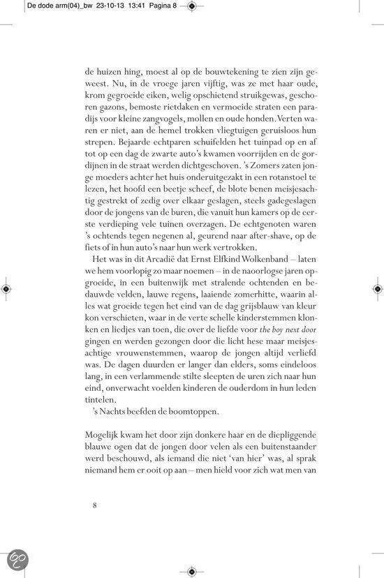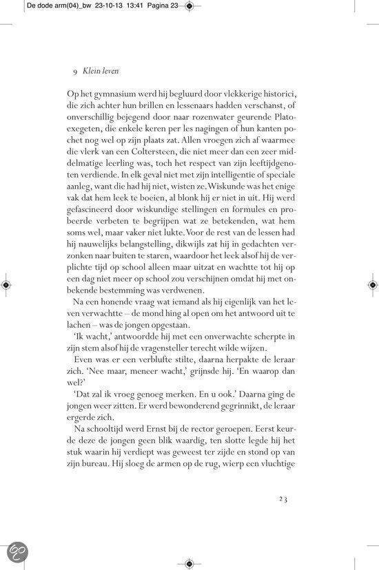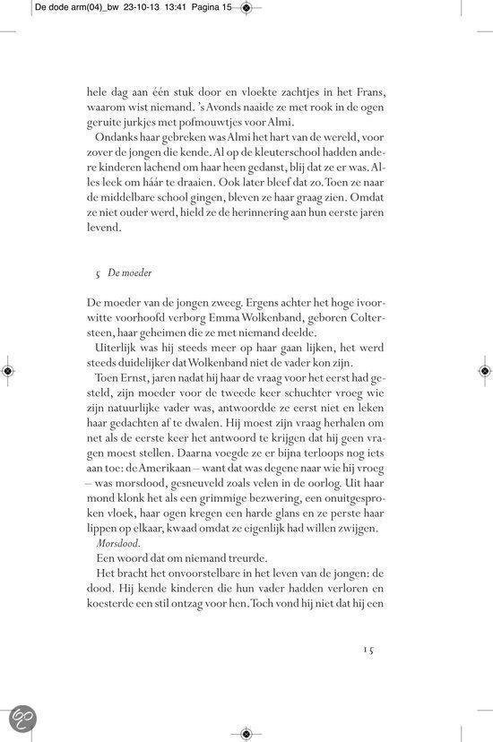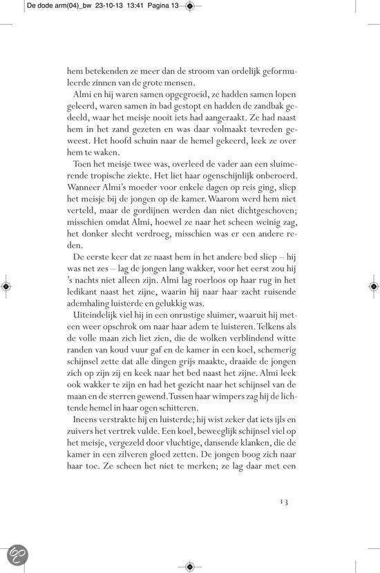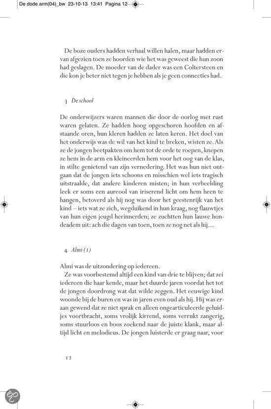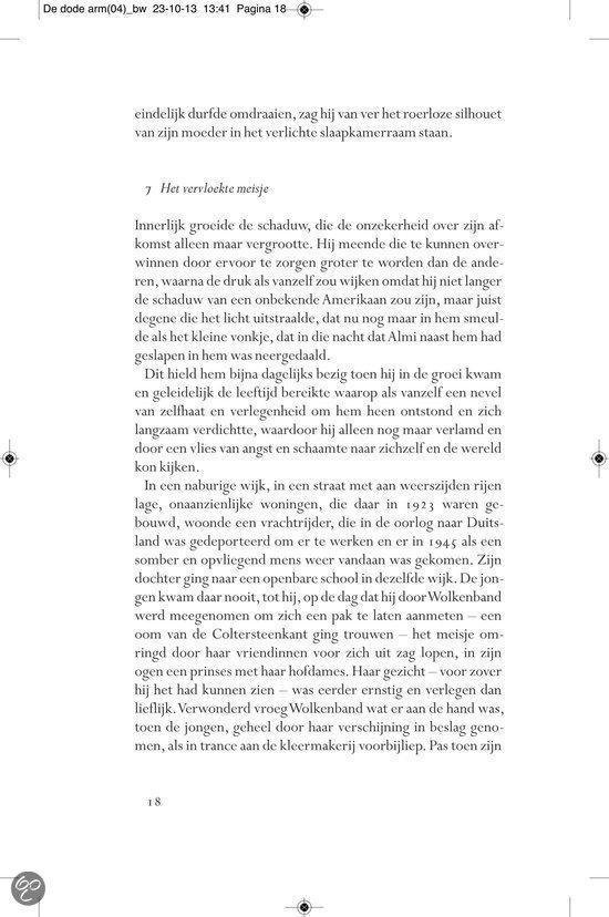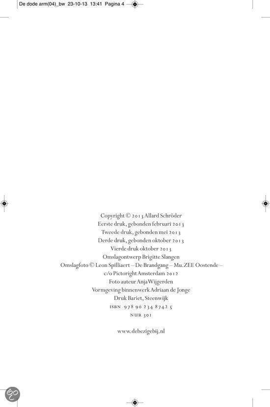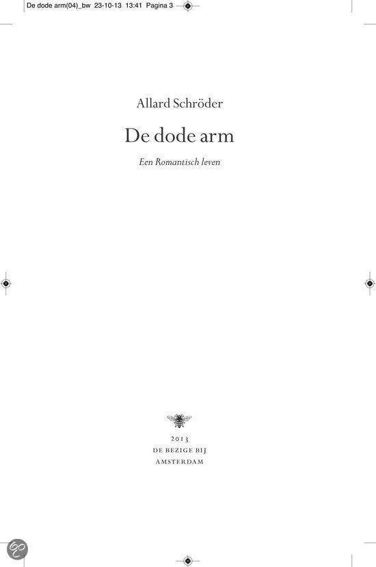 Ergens in de landelijke omgeving van het provinciestadje A. meandert een rivier. In een zijtak van dit water, niet meer dan een stilstaande poel, verdwijnt op een dag Almi, het jeugdvriendinnetje van de jongen Ernst Elfkind Coltersteen. Het zal niet de laatste vrouw zijn die plotseling uit het leven van Ernst wordt weggerukt. In De dode arm volgen we de lotgevallen van deze vreemde jongeman. Een `onecht kind, over wiens afwezige vader angstvallig wordt gezwegen. Ernst groeit op tot een man zonder eigenschappen, een `man van glas , aan wie het leven voorbij lijkt te trekken zonder dat hij er veel vat op heeft. In een bezwerende stijl beschrijft Allard Schröder Ernsts zoektocht naar zijn vader, zijn afkomst, zijn identiteit. Op de achtergrond zien we intussen de naoorlogse Europese geschiedenis zich voltrekken. Allard Schröder (1946) schreef romans,verhalen, essays en poëzie. Voor Raaf kreeg hij de Halewijnprijs en voor Grover de ECI-prijs. De hydrograaf werd in 2002 bekroond met de AKO Literatuurprijs. In 2010 verscheen zijn poëziebundel Het meisje met de afstandsbediening.Lees hier de toespraak die Manon Uphoff hield tijdens de presentatie van De dode arm. Over Raaf: `Omvangrijke, ambitieuze en fascinerende roman. HP/De Tijd `Indrukwekkende roman NRC Handelsblad Over De hydrograaf: `Een boek waarin je helemaal opgaat en dat achteraf aanstekelijk in je herinnering blijft ronddwalen. De Morgen Over Amoy: `Romankunst in optima forma. De Groene Amsterdammer Over De econome: `Voor minder dan De econome doen we het voortaan niet meer. Vrij Nederland