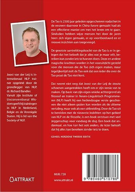 Dat neemt niet weg dat Joost van der Leij de stoute schoenen aangetrokken heeft om er zijn versie van te maken. Op basis van zijn eigen unieke achtergrond als filosoof en trainer in Neuro-Linguïstisch Programmeren (NLP) heeft hij een hedendaagse versie geschreven die niet alleen gezien kan worden als de ultieme vertaling, maar ook als een uitbreiding. Door de Tao uit te bereiden met de nieuwste inzichten op het gebied van NLP en de filosofie, is een boek ontstaan met veel zeggenschap voor vandaag de dag. Een boek dat andermaal, en hoe kan het ook anders, de lezer belooft dat hij alles kan bereiken zonder iets te doen.