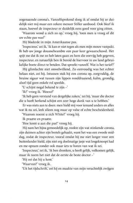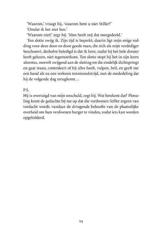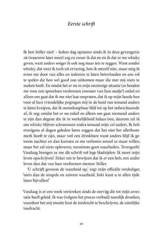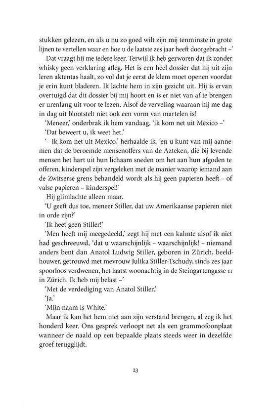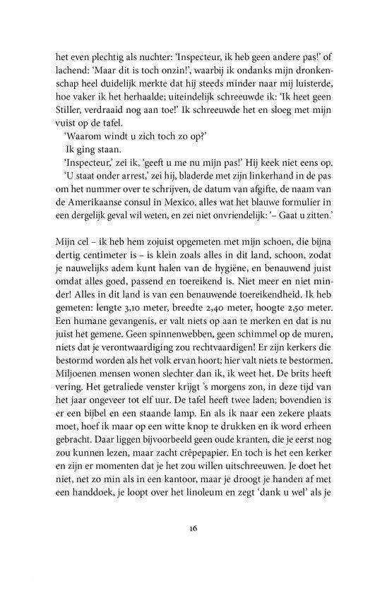 Om te bewijzen wie hij echt is, bekent White/Stiller drie onopgeloste moorden, en vertelt zeer gedetailleerd over een avontuurlijk leven in Mexico en Amerika tussen de cowboys en dokwerkers. Hij wordt verteerd door een drang om te overtuigen, maar niemand gelooft hem. Zelfs zijn eigen vrouw herkent hem als Stiller. Voorzichtig verkennen de gevangene en zijn vermeende vrouw hun onderbroken relatie. Maar daarvoor zullen ze het beeld dat ze van elkaar hebben gevormd moeten loslaten.