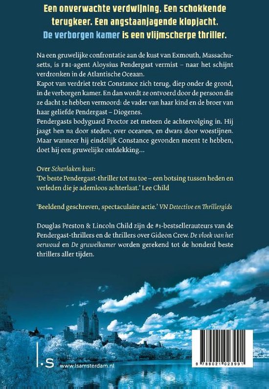FBI-detective Aloysius Pendergast is terug! De verborgen kamer van Preston & Child, het zestiende deel in de Pendergast-serie, is nóg spannender dan Scharlaken kust. Pendergast is vermist – en het lijkt alsof hij na zijn laatste onderzoek is verdronken aan de kust van Massachusetts. Pendergasts pupil, Constance, is geschokt door zijn vermissing en trekt zich terug in haar kamer diep onder hun herenhuis aan Riverside Drive. Zij en Pendergasts huisbediende, Proctor, zijn alleen in het huis als Pendergasts geduchte broer Diogenes – die iedereen voor dood hield – opeens opdaagt. Proctor wordt bewusteloos geslagen en wanneer hij later bijkomt, ontdekt hij dat Diogenes Constance heeft ontvoerd. Proctor komt meteen in actie en gaat op zoek. Maar wanneer hij eindelijk Constance gevonden denkt te hebben, doet hij een gruwelijke ontdekking: waar Constance had moeten zijn, staat alleen een gekoelde doodskist…