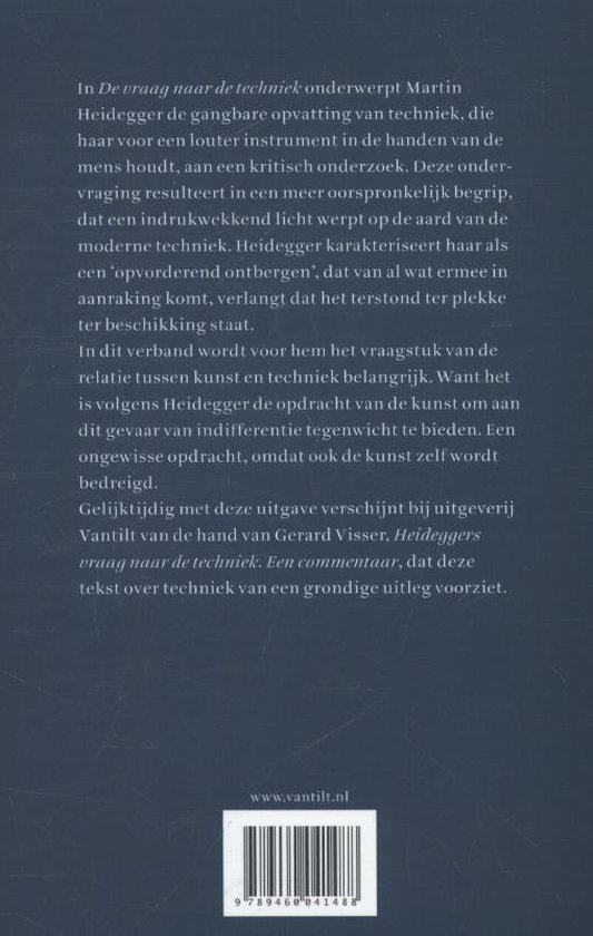In De vraag naar de techniek onderwerpt Martin Heidegger de gangbare opvatting van techniek, die haar voor een louter instrument in de handen van de mens houdt, aan een kritisch onderzoek. Deze ondervraging resulteert in een meer oorspronkelijk begrip, dat een indrukwekkend licht werpt op de aard van de moderne techniek. Heidegger karakteriseert haar als een ‘opvorderend ontbergen’, dat van al wat ermee in aanraking komt, verlangt dat het terstond ter plekke ter beschikking staat. In dit verband wordt voor hem het vraagstuk van de relatie tussen kunst en techniek belangrijk. Want het is volgens Heidegger de opdracht van de kunst om aan dit gevaar van indifferentie tegenwicht te bieden. Een ongewisse opdracht, omdat ook de kunst zelf wordt bedreigd. Gelijktijdig met deze uitgave verschijnt bij uitgeverij Vantilt van de hand van Gerard Visser, Heideggers vraag naar de techniek. Een commentaar, dat deze tekst over techniek van een grondige uitleg voorziet.