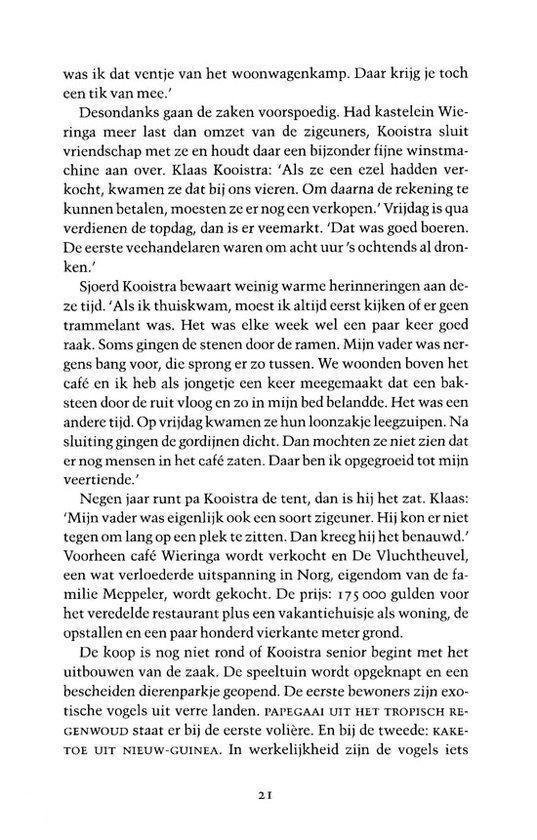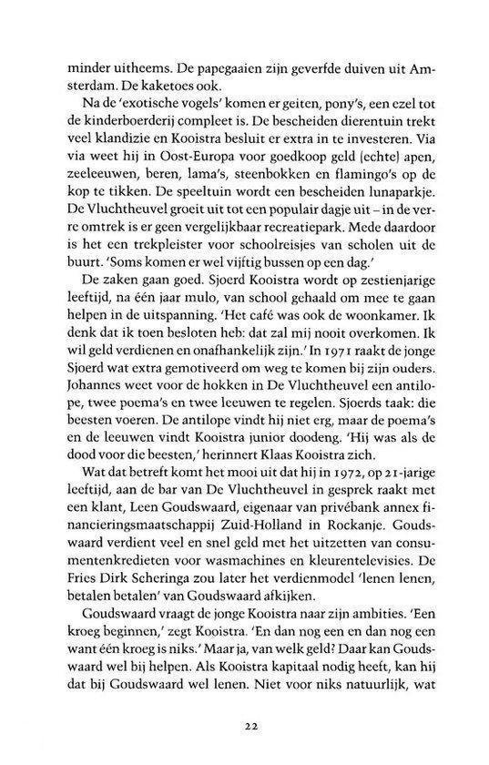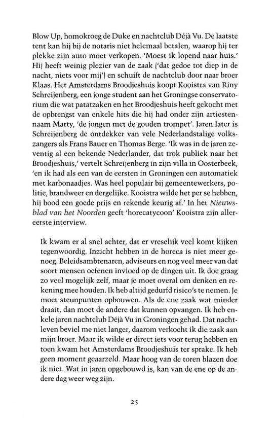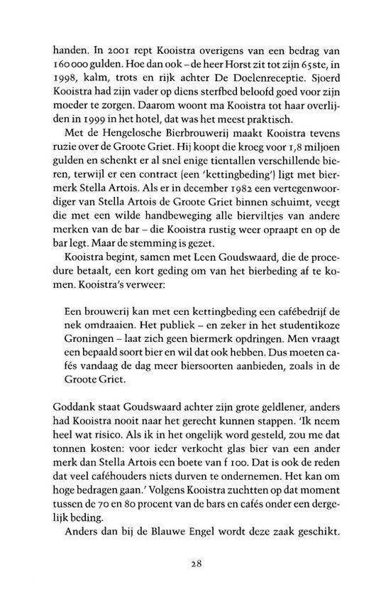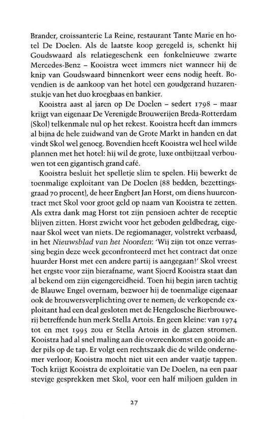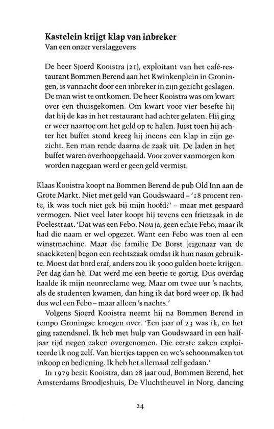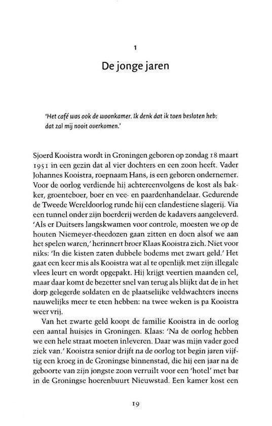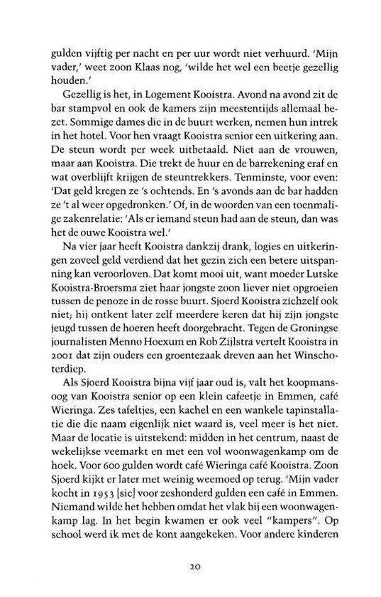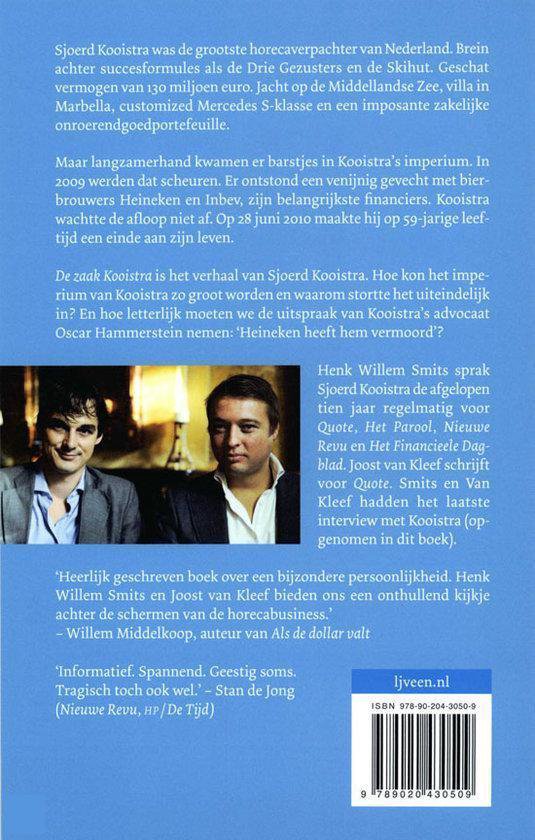 De zaak Kooistra is het verhaal van horecamagnaat Sjoerd Kooistra. Het beschrijft hoe zijn imperium zo groot kon worden en waarom het uiteindelijk instortte, met een faillissement en zelfmoord tot gevolg. ‘Ik had achteraf een beetje spijt dat ik niet aan het boek heb meegewerkt. Dat kan ik nu wel toegeven, ik vond het een interessant werk, alleen mijn kant van het verhaal ontbrak, misschien kunnen we dat nu rechtzetten.’ – Dick Loorbach, weduwnaar Kooistra Deze geΓΌpdatete versie is aangevuld met reacties van Sjoerd Kooistra’s weduwnaar Dick Loorbach en diens broer Bert, en met nieuws over de afhandeling en ontmanteling van Kooistra’s kroegenimperium. Bovendien wordt er aandacht besteed aan zijn band met sterrenwichelaars en zijn nieuwe, zeer exclusieve foto’s opgenomen.