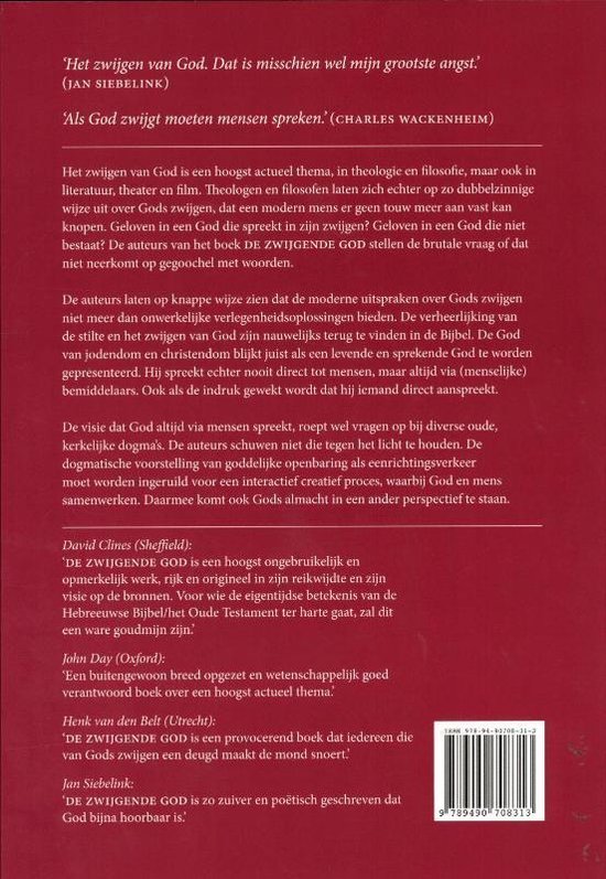 Tweede druk. Twee theologen geven een nieuwe visie op de communicatie tussen goden en mensen. Het zwijgen van God is een hoogst actueel thema, in theologie en filosofie, maar ook in literatuur, theater en film. Theologen en filosofen laten zich echter op zo dubbelzinnige wijze uit over Gods zwijgen, dat een modern mens er geen touw meer aan vast kan knopen. Geloven in een God die spreekt in zijn zwijgen? Geloven in een God die niet bestaat? De verheerlijking van de stilte en het zwijgen van God zijn nauwelijks terug te vinden in de Bijbel. De God van jodendom en christendom blijkt juist als een levende en sprekende God te worden gepresenteerd. Hij spreekt echter nooit direct tot mensen, maar altijd via (menselijke) bemiddelaars. Ook als de indruk gewekt wordt dat hij iemand direct aanspreekt. De dogmatische voorstelling van goddelijke openbaring als eenrichtingsverkeer moet worden ingeruild voor een interactief creatief proces, waarbij God en mens samenwerken. Daarmee komt ook Gods almacht in een ander perspectief te staan. Jan Siebelink: Βde zwijgende god is zo zuiver en poΓ«tisch geschreven dat God bijna hoorbaar is.Β David Clines (Sheffield): Βde zwijgende god is een hoogst ongebruikelijk en opmerkelijk werk, rijk en origineel in zijn reikwijdte en zijn visie op de bronnen. Voor wie de eigentijdse betekenis van de Hebreeuwse Bijbel/het Oude Testament ter harte gaat, zal dit een ware goudmijn zijn.Β Henk van den Belt (Utrecht): Βde zwijgende god is een provocerend boek dat iedereen die van Gods zwijgen een deugd maakt de mond snoert.Β John Day (Oxford): ΒEen buitengewoon breed opgezet en wetenschappelijk goed verantwoord boek over een hoogst actueel thema.Β