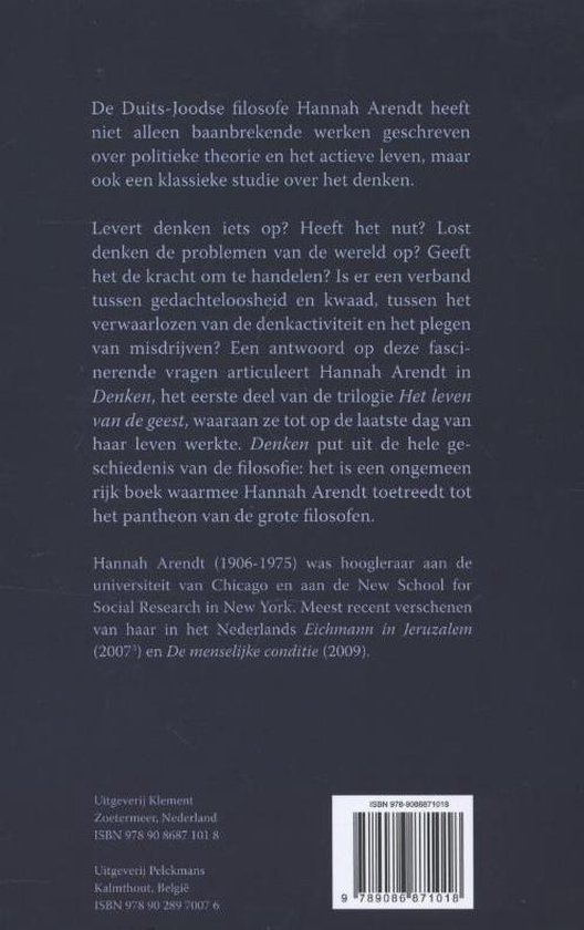 Waarom laten we ons in met een activiteit die niet alleen geen enkele waarheid oplevert, maar die tegelijkertijd ook geen enkel praktisch nut dient? In Denken, het eerste deel van haar trilogie ‘Het leven van de geest’, buigt Hannah Arendt zich over het denken. Levert denken iets op? Zet het aan tot handelen? Lost het de problemen van de wereld op? Heeft het nut?