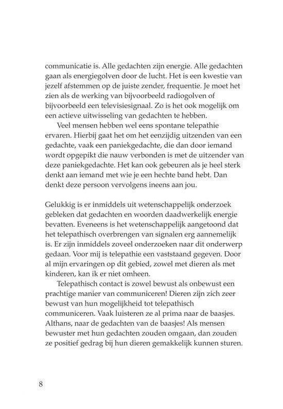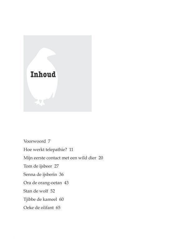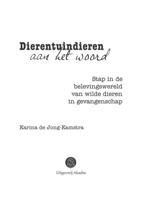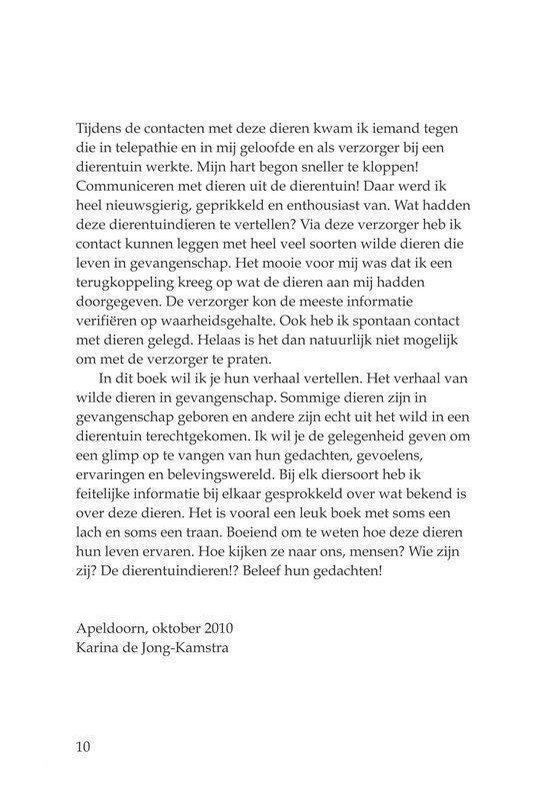 Dit eerste boek over de belevingswereld van dierentuindieren is een echte aanrader voor dierenliefhebbers! Op boeiende wijze vertelt dierentolk Karina de Jong-Kamstra over haar contact met deze dieren. Zij ‘interviewde’ onder andere olifanten, ijsberen en leeuwen over wat er in hen omgaat, hoe zij hun gevangenschap ervaren en hoe zij naar ons mensen kijken, en ook gorilla Bokito komt aan het woord. Ook geeft Karina praktische tips om zelf met je eigen dier van gedachten te wisselen. Handig om ongewenst gedrag te verklaren.