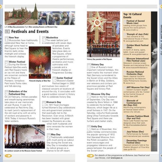 Whether you’re looking for the things not to miss at the Top 10 sights, or want to find the best nightspots of Moscow, this book features dozens of Top 10 lists – from the Top 10 museums to the Top 10 events and festivals – there’s even a list of the Top 10 things to avoid.