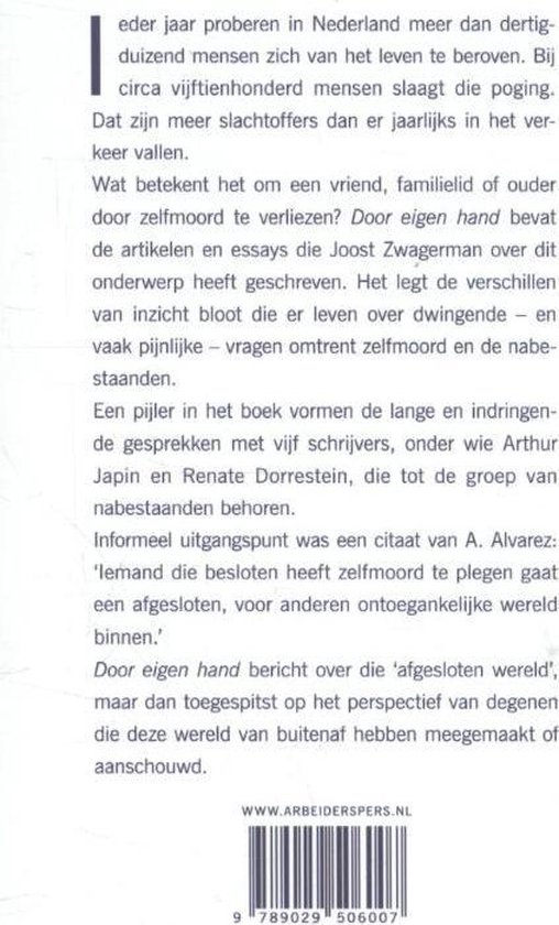 Wat betekent het om een vriend, familielid of ouder door zelfmoord te verliezen? Door eigen hand bevat de artikelen en essays die Joost Zwagerman over dit onderwerp heeft geschreven. Het legt de verschillen van inzicht bloot die er leven over dwingende – en vaak pijnlijke – vragen omtrent zelfmoord en de nabestaanden.