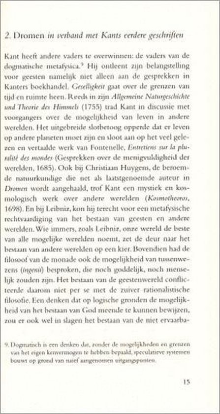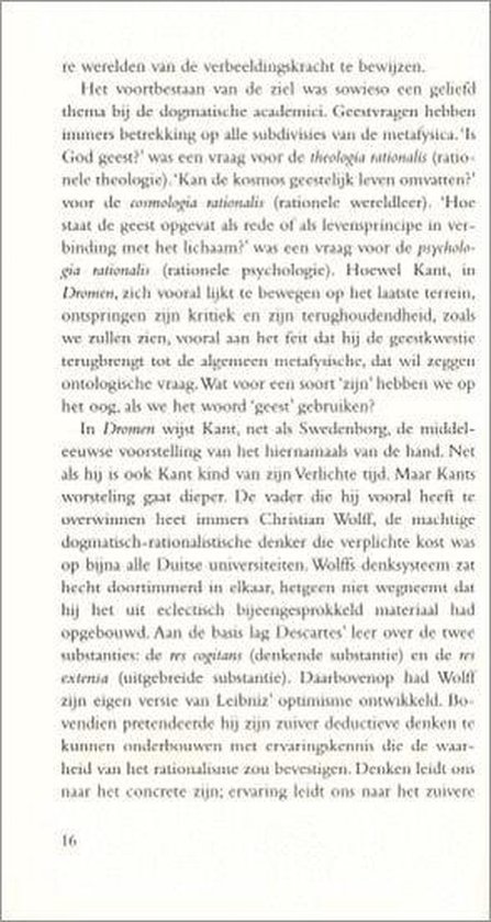 In Dromen buigt Kant zich over de paranormale ervaringen van de Zweedse natuurwetenschapper Swedenborg. In dit satirische geschrift noemt hij Swedenborg een dromer, iemand die heilig gelooft in dingen die er niet zijn. Het bestaan van geesten bijvoorbeeld kunnen we volgens Kant niet bewijzen, maar ook niet weerleggen.