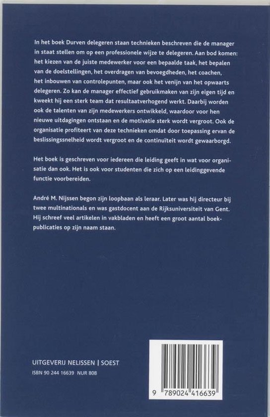 In het boek Durven delegeren staan technieken beschreven die de manager in staat stellen om op een professionele wijze te delegeren. Aan bod komen: het kiezen van de juiste medewerker voor een bepaalde taak, het bepalen van de doelstellingen, het overdragen van bevoegdheden, het coachen, het inbouwen van controlepunten, maar ook het venijn van het opwaarts delegeren. Zo kan de manager effectief gebruikmaken van zijn eigen tijd en kweekt hij een sterk team dat resultaatverhogend werkt. Daarbij worden ook de talenten van zijn medewerkers ontwikkeld, waardoor voor hen nieuwe uitdagingen ontstaan en de motivatie sterk wordt vergroot. Ook de organisatie profiteert van deze technieken omdat door toepassing ervan de beslissingssnelheid wordt vergroot en de continuïteit wordt gewaarborgd.
