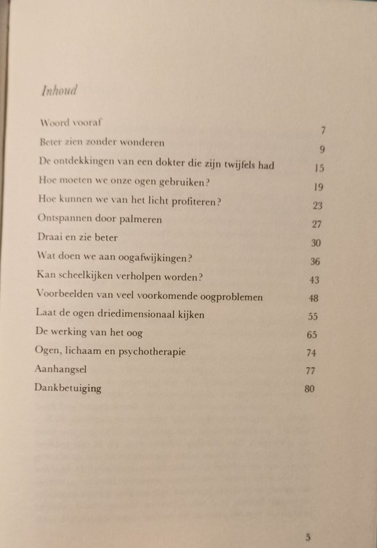 U draagt cen bril of anders loopt u de kans er binnenkort een op uw neus te hebben. Anders zou u vast dit boek niet zitten in te kijken. Volgens u draagt u die bril de rest van uw leven ook wel. Elke paar jaarsterkere glazen, omdat uw ogen achteruitgaan. Maar u kunt beter leren zien zonder bril dan u nu met dat ding op uw neus doet. Of u moest de bekende uitzondering op de regel vormen. Dat geldt trouwens ook voor alle andere honderdduizenden Nederlanders met bril en voor de tienduizenden met contactlenzen die nóg duurder zijn. Dit boek wil u daar iets over vertellen. Maar voor u mocht denken met een of andere dwaas te doen te hebben, moet u eerst het volgende praktijkgeval eens lezen. Toen ik mevrouw H. voor het eerst ontmoette, was ze 84 jaar. Ze kon haast niet meer lopen, omdat ze zo dik was en last van reuma had. Bovendien was ze blind. Ofschoon ik met haar te doen had, betekende ze ook een hele uitdaging voor me. Natuurlijk kon ik ntets veranderen aan de reuma en haar zwaarlijvigheid, omdat ik geen huisarts ben. Maar als medewerkster aan het instituut voor verbetering van het gezichtsvermogen kon ik natuurlijk wel proberen iets aan haar blindheid te doen. Mevrouw H. was mijn eerste patiënte die ik buiten het instituut (waar ik ook gestudeerd had), behandelde. En eigenlijk leek het erop alsof ze mij wou bewijzen dat ik een heel verkeerd beroep had gekozen. Gelukkig wist ik wel beter. Jaren geleden waren de moeilijkheden bij mevrouw H. begonnen met verziendheid, iets dat veel voorkomt bij mensen op middelbare leeftijd (verziendheid wordt veroorzaakt door verslapping van de oogspieren. Een beschrijving van het oog wordt op blz. 65 e.v. gegeven). Het gezichtsvermogen van mevrouw H. liep snel achteruit. Tot overmaat van ramp kreeg ze grijze staar. Bij deze kwaal wordt de lens min of meer vertroebeld. Die van mevrouw H. was op den duur helemaal troebel geworden. Ze was er dan ook aan geopereerd. Na de grijze staar had ze nog drie acute aanvallen van groene staar gehad. Bij deze kwaal loopt de druk van het vocht in het inwendige oog sterk op, wat een pijnlijke en gevaarlijke druk op de oogappel veroorzaakt. Al met al had mevrouw H. vijf operaties ondergaan, drie operaties voor groene en twee voor grijze staar en dat alles was op een totale blindheid uitgelopen. Ze kon alleen nog onderscheid maken tussen licht en donker. Hieruit blijkt wel dat ze ook niet gebaat was met een bril, al was die van nog zulke sterke glazen voorzien. Eén keer per week ging ik anderhalf uur bij mevrouw H. op visite.