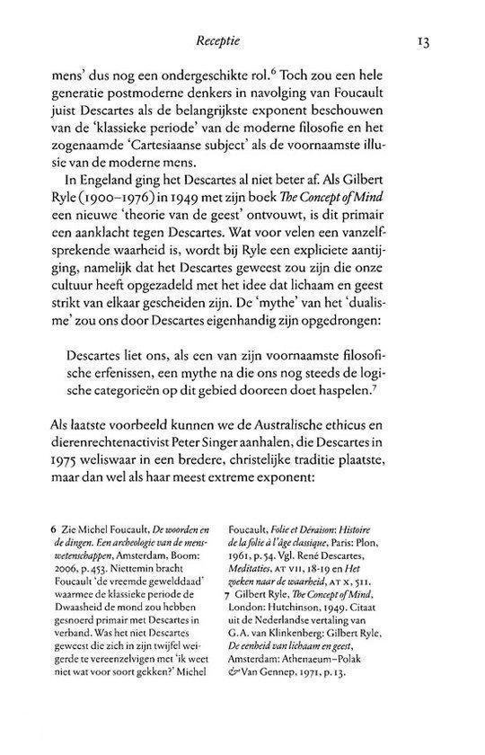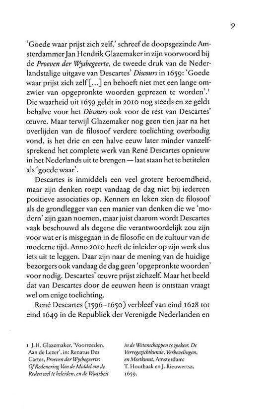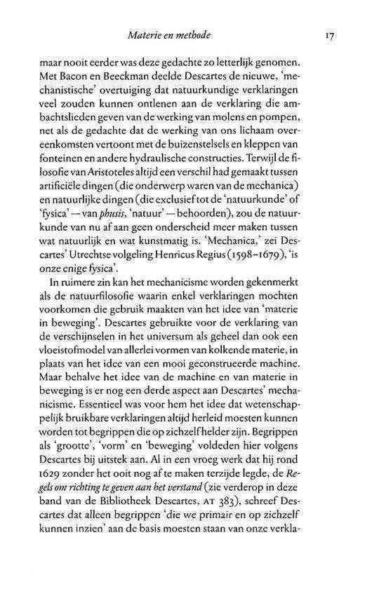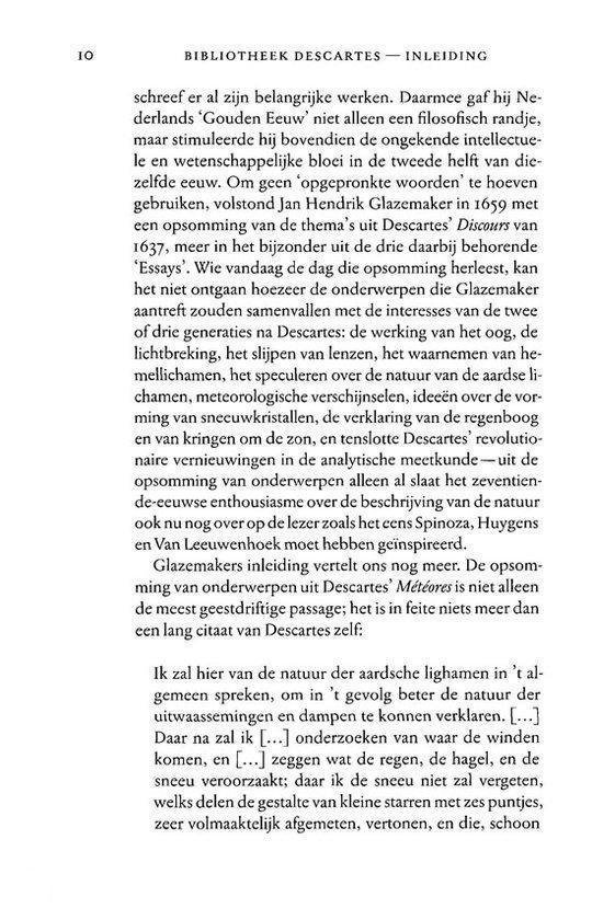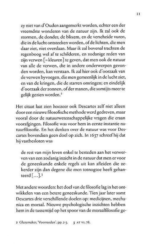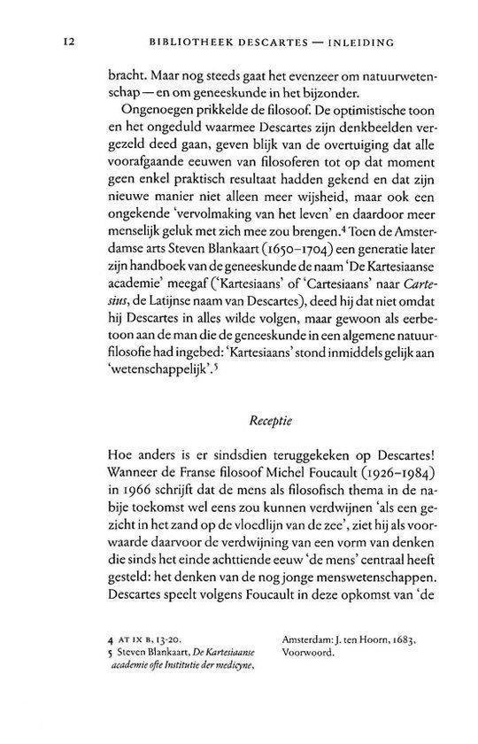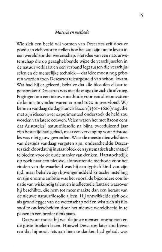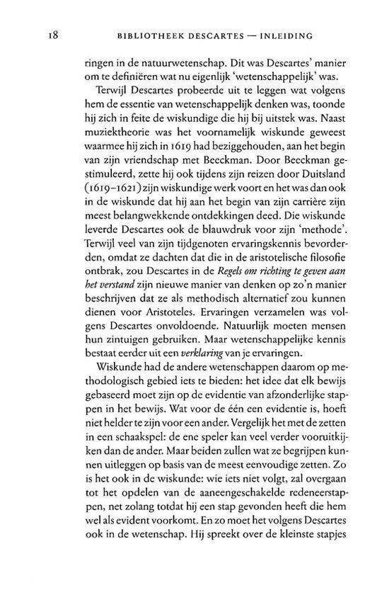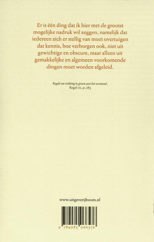 Regels voor het verstand Band 1 René Descartes In band 1 is Descartesvroegste werk in het Latijn opgenomen, waaronder Regels om richting te geven aan het verstand. Hij doet hierin een aanzet tot het formuleren van de juiste methode voor wetenschappelijk en filosofisch denken. Daartoe ontwerpt hij 21 regels. Het werk is onvoltooid, maar vormt de basis voor zijn latere methodiek. Naast de Regels vindt men in dit deel drie kleinere vroege werken, waaronder Descartes opmerkelijke muziektheorie en zijn opgetekende dromen. Over de auteur(s): René Descartes (1596-1650) was een Franse filosoof en wiskundige. Ook leverde hij bijdragen aan de natuurkunde en fysiologie. Hij legde de basis voor de zeventiende- eeuwse stroming van het rationalisme en wordt algemeen beschouwd als de vader van de moderne filosofie. Descartes woonde en werkte twintig jaar in Nederland waar hij ook zijn belangrijkste werken schreef: achtereenvolgens in Franeker, Amsterdam, Leiden, Deventer, Harderwijk, Utrecht, Amersfoort, Leeuwarden, Oegstgeest, Santpoort, Egmond aan den Hoef en uiteindelijk in Egmond Binnen. Bibliotheek Descartes Na Over de methode, Meditaties en De uitgelezen Descartes bereidt Uitgeverij Boom nu het verzameld werk van Descartes voor. Acht banden, met daarin vrijwel het complete wijsgerige en wetenschappelijke oeuvre in chronologische volgorde en een selectie van de correspondentie. De bibliotheek bevat veel nooit eerder vertaald werk. De bibliotheek wordt bezorgd door de internationale Descartes-experts Erik-Jan Bos (Universiteit Utrecht) en Han van Ruler (Erasmus Universiteit Rotterdam). De filosofie van René Descartes wordt gezien als het fundament voor het moderne denken. Zijn cogito, ergo sum (ik denk, dus ik ben) was de eerste formulering van het moderne zelfbewustzijn.