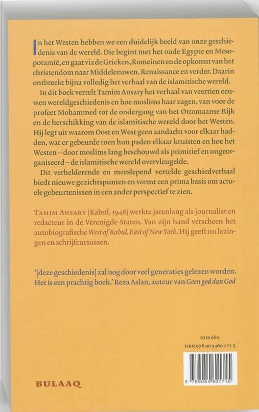 In dit boek vertelt Tamim Ansary het verhaal van veertien eeuwen wereldgeschiedenis en hoe moslims haar zagen, van voor de profeet Mohammed tot de ondergang van het Ottomaanse Rijk en de herschikking van de islamitische wereld door het Westen.