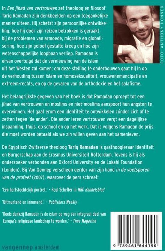 In EEN JIHAD VAN VERTROUWEN zet theoloog en filosoof Tariq Ramadan zijn denkbeelden op een toegankelijke manier uiteen. Hij schetst allereerst zijn persoonlijke ontwikkeling, hoe hij door zijn reizen betrokken is geraakt bij de problemen van armoede, migratie en globalisering, hoe zijn geloof gestalte kreeg en hoe zijn wetenschappelijke loopbaan verliep. Ramadan is ervan overtuigd dat de vernieuwing van de islam uit het Westen zal komen; om deze stelling te onderbouwen gaat hij vervolgens in op de verhouding tussen islam en homoseksualiteit, vrouwenemancipatie en extreem-rechts, en op de gevaren van de orthodoxie en het salafisme. Het belangrijkste gegeven van het boek is dat Ramadan oproept tot een jihad van vertrouwen en moslims en niet-moslims aanspoort hun angsten te overwinnen. Het gaat erom een identiteit te ontwikkelen zónder zich af te zetten tegen ‘de ander’. Die ander leren vertrouwen vergt een dagelijkse inspanning, thuis, op school en op het werk. Dat is volgens Ramadan de prijs die moet worden betaald als we zin willen geven aan het samenleven. De Egyptisch-Zwitserse theoloog Tariq Ramadan is gasthoogleraar Identiteit en Burgerschap aan de Erasmus Universiteit Rotterdam. Tevens is hij als onderzoeker verbonden aan Oxford University en de Lokahi Foundation (Londen). Bij Van Gennep verscheen eerder van zijn hand tevens RADICALE HERVORMING en IN DE VOETSPOREN VAN DE PROFEET.