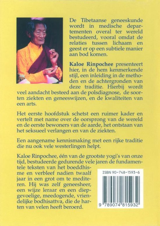 Kaloe Rinpochee presenteert hier, in de hem kenmerkende stijl, een inleiding in de methoden en de achtergronden van deze traditie. Hierbij wordt veel aandacht besteed aan de polsdiagnose, de soorten ziekten en geneeswijzen, en de kwaliteiten van de arts.