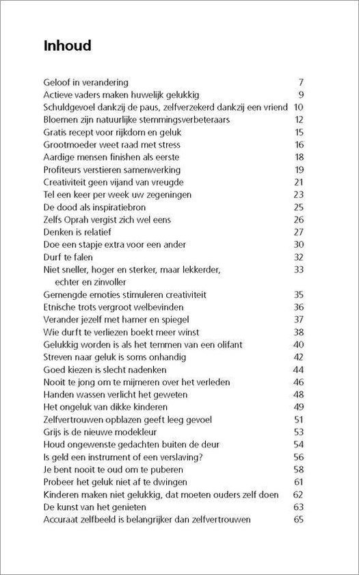 Iedereen lijkt met geluk bezig te zijn. Niet zo verwonderlijk in deze tijd: materieel hebben we alles, maar maakt dat nou echt gelukkig? We zoeken verdieping, welbevinden, harmonie, rust, maar geluk blijkt een schaars goed en niet te koop. Niemand kan precies vertellen wat geluk is en hoe je dat bereikt. Wat voor de een meer dan genoeg is om gelukkig te zijn, is voor de ander volstrekt onvoldoende. Mensen die pretenderen exact te weten wat geluk is en hoe iedereen gelukkig wordt, slaan de plank mis.