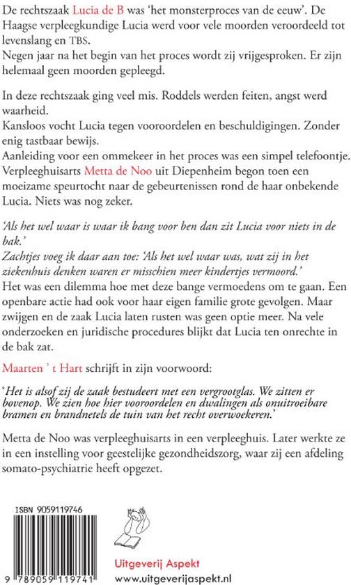 De rechtszaak Lucia de B was ‘het monsterproces van de eeuw’. De Haagse verpleegkundige Lucia werd voor vele moorden veroordeeld tot levenslang en TBS. Negen jaar na het begin van het proces wordt zij vrijgesproken. Er zijn helemaal geen moorden gepleegd. In deze rechtszaak ging veel mis. Roddels werden feiten, angst werd waarheid. Kansloos vocht Lucia tegen vooroordelen en beschuldigingen. Zonder enig tastbaar bewijs. Aanleiding voor een ommekeer in het proces was een simpel telefoontje. Verpleeghuisarts Metta de Noo uit Diepenheim begon toen een moeizame speurtocht naar de gebeurtenissen rond de haar onbekende Lucia. Niets was nog zeker. ‘Als het wel waar is waar ik bang voor ben dan zit Lucia voor niets in de bak.’ Zachtjes voeg ik daar aan toe: ‘Als het wel waar was, wat zij in het ziekenhuis denken waren er misschien meer kindertjes vermoord.’ Het was een dilemma hoe met deze bange vermoedens om te gaan. Een openbare actie had ook voor haar eigen familie grote gevolgen. Maar zwijgen en de zaak Lucia laten rusten was geen optie meer. Na vele onderzoeken en juridische procedures blijkt dat Lucia ten onrechte in de bak zat. Maarten ’ t Hart schrijft in zijn voorwoord: ‘Het is alsof zij de zaak bestudeert met een vergrootglas. We zitten er bovenop. We zien hoe hier vooroordelen en dwalingen als onuitroeibare bramen en brandnetels de tuin van het recht overwoekeren.’ Metta de Noo was verpleeghuisarts in een verpleeghuis. Later werkte ze in een instelling voor geestelijke gezondheidszorg, waar zij een afdeling somato-psychiatrie heeft opgezet.