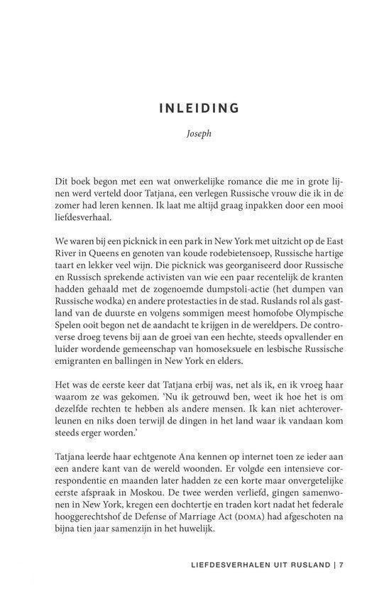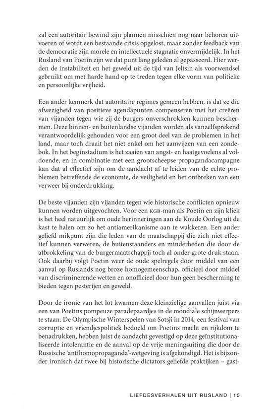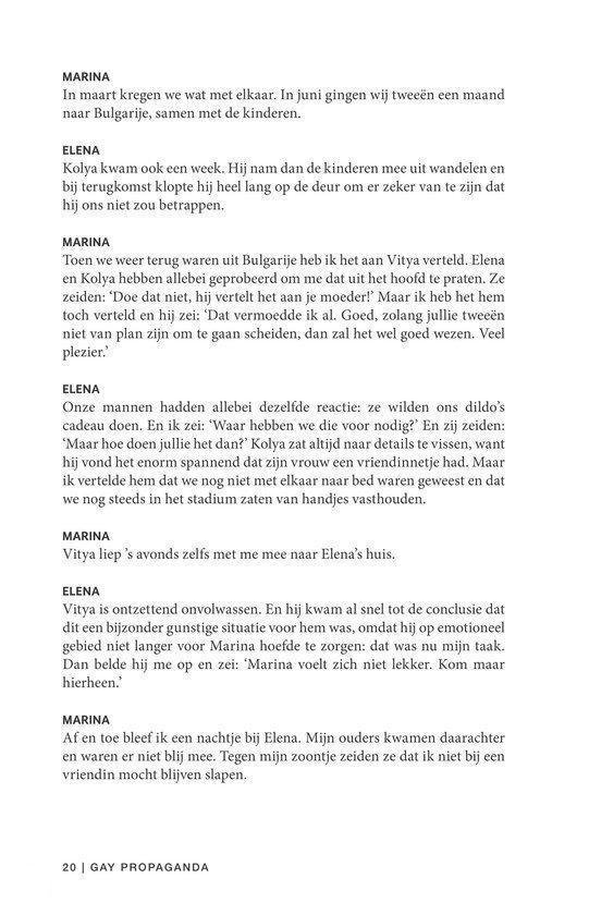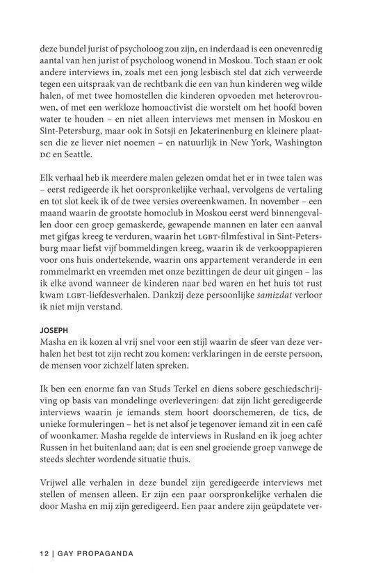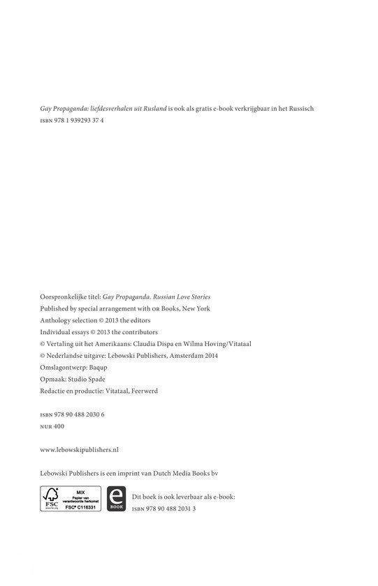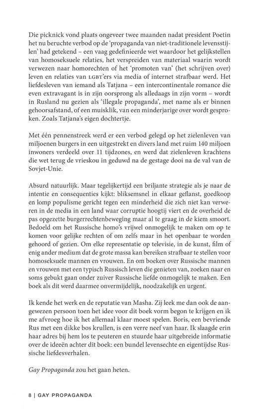 Gay Propaganda: liefdesverhalen uit Rusland is een tegengeluid, een provocatief verweer tegen het verbod op ‘homoseksuele propaganda’ in Rusland. Het boek bevat verhalen van mannen en vrouwen die al jaren een relatie hebben met iemand van hetzelfde geslacht. Mensen die de liefde hebben gevonden of er nog altijd naar op zoek zijn en de uitdaging aangaan om hun leven in Rusland voort te zetten of noodgedwongen hun heil ergens anders proberen te zoeken.