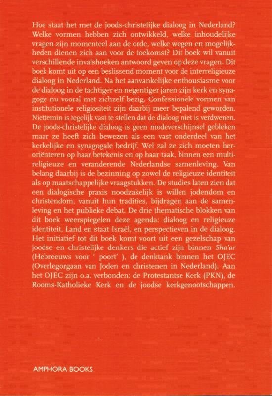 Hoe staat het met de joods-christelijke dialoog in Nederland? Welke vormen hebben zich ontwikkeld, welke inhoudelijke vragen zijn momenteel aan de orde, welke wegen en mogelijkheden dienen zich aan voor de toekomst? Dit boek wil vanuit verschillende invalshoeken antwoord geven op deze vragen. Dit boek komt uit op een beslissend moment voor de interreligieuze dialoog in Nederland. Na het aanvankelijke enthousiasme voor de dialoog in de tachtiger en negentiger jaren zijn kerk en synagoge nu vooral met zichzelf bezig. Confessionele vormen van institutionele religiositeit zijn daarbij meer bepalend geworden. Niettemin is tegelijk vast te stellen dat de dialoog niet is verdwenen. De joods-christelijke dialoog is geen modeverschijnsel gebleken maar ze heeft zich bewezen als een vast onderdeel van het kerkelijke en synagogale bedrijf. Wel zal ze zich moeten heroriënteren op haar bekentenis en op haar taak, binnen een multireligieuze en veranderende Nederlandse samenleving. Van belang daarbij is de bezinning op zowel de religieuze identiteit als op de maatschappelijke vraagstukken. De studies laten zien dat een dialogische praxis noodzakelijk is willen jodendom en christendom, vanuit hun tradities, bijdragen aan de samenleving en het publieke debat. De drie thematische blokken van dit boek weerspiegelen deze agenda: dialoog en religieuze identiteit, Land en staat Israël, en perspectieven in de dialoog. Het initiatief tot dit boek komt voort uit een gezelschap van joodse en christelijke denkers die actief zijn binnen Sha’ar (Hebreeuws voor ‘poort’), de denktank binnen het OJEC (Overlegorgaan van Joden christenen in Nederland). Aan het OJEC zijn o.a. verbonden: de Protestantse Kerk (PKN), de Rooms-Katholieke Kerk en de joodse kerkgenootschappen.