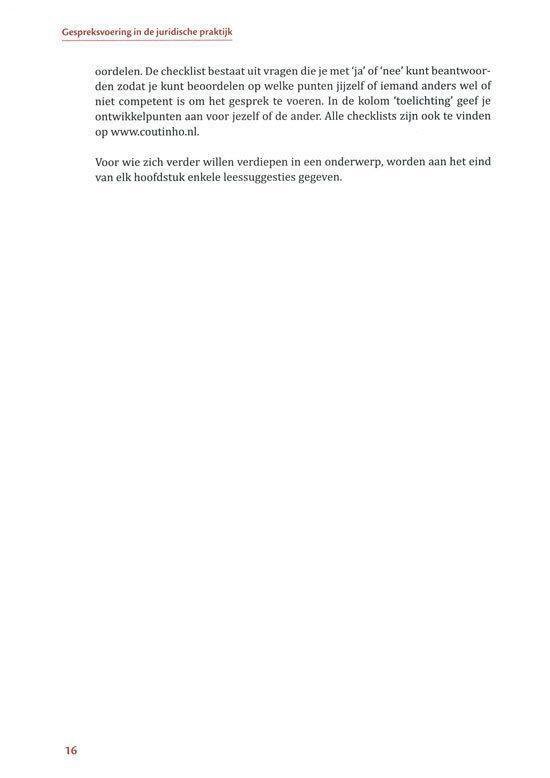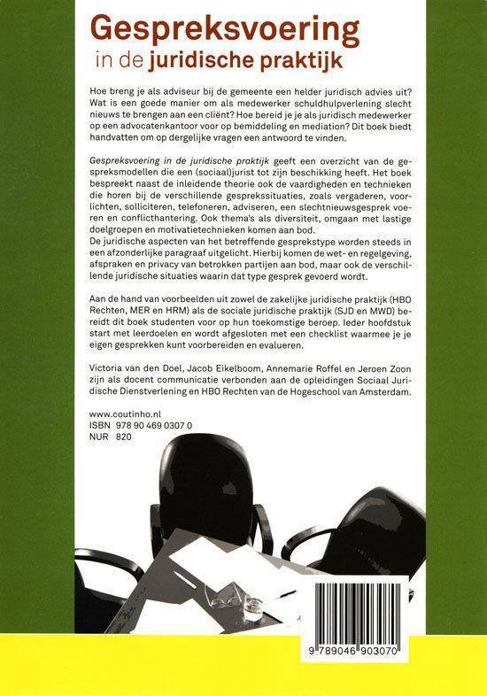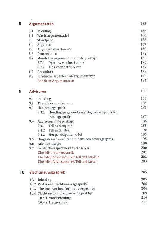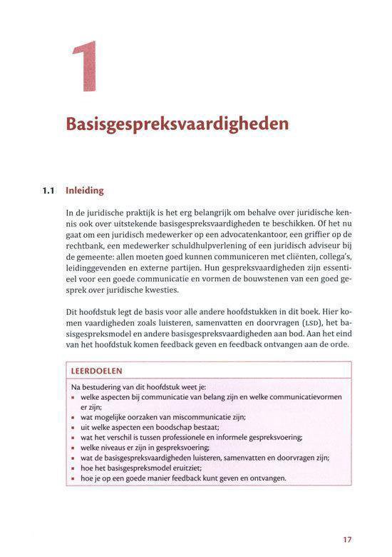 Aan de hand van voorbeelden uit zowel de zakelijke juridische praktijk (HBO Rechten, MER en HRM) als de sociale juridische praktijk (SJD en MWD) bereidt dit boek studenten voor op hun toekomstige beroep. Ieder hoofdstuk start met leerdoelen en wordt afgesloten met een checklist waarmee je je eigen gesprekken kunt voorbereiden en evalueren.
