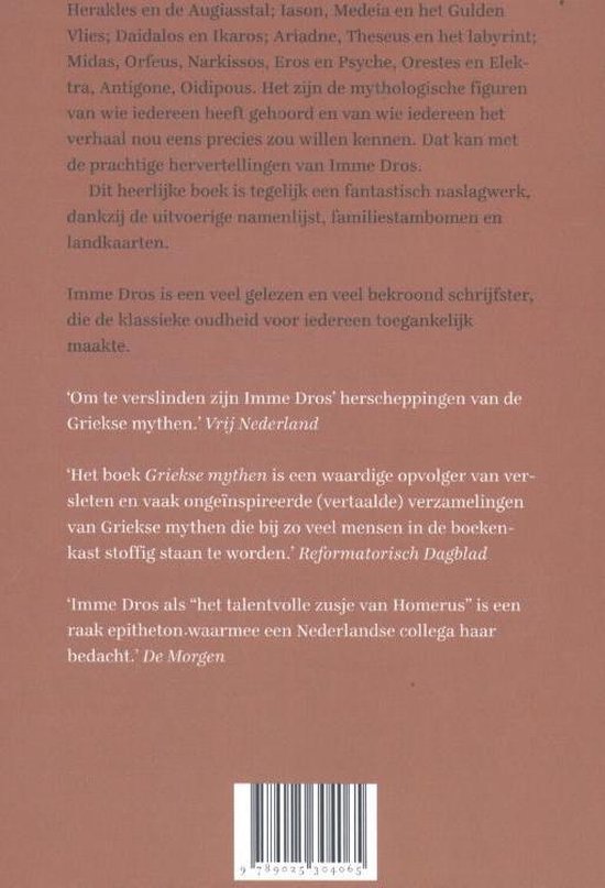 Herakles en de Augiasstal; Iason, Medeia en het Gulden Vlies; Daidalos en Ikaros; Ariadne, Theseus en het labyrint; Midas, Orfeus, Narkissos, Eros en Psyche, Orestes en Elektra, Antigone, Oidipous. Het zijn de mythologische figuren van wie iedereen heeft gehoord en van wie iedereen het verhaal nou eens precies zou willen kennen. Dat kan met de prachtige hervertellingen van Imme Dros.