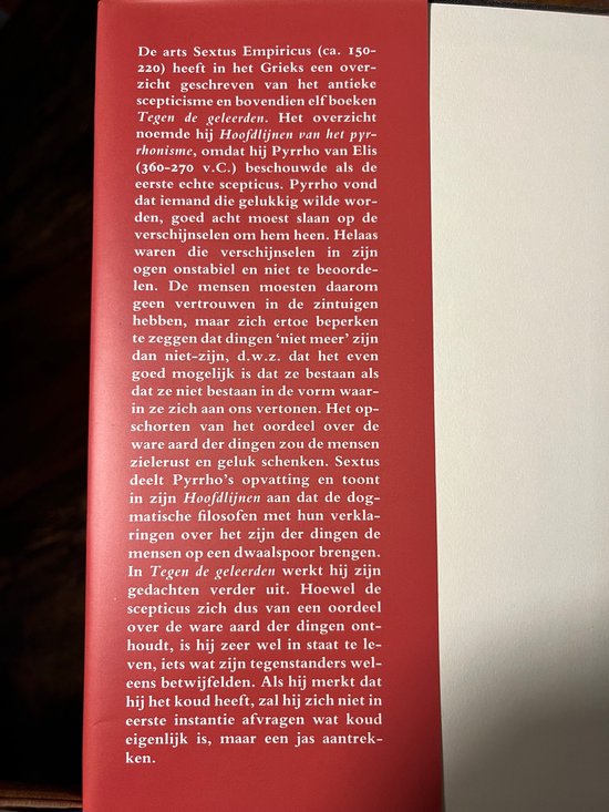 Dr. Rein Ferwerda heeft alle overgeleverde geschriften van Sextus voor het eerst in het Nederlands vertaald. In de inleiding laat hij de lezer niet alleen kennismaken met het antieke scepticisme maar ook met moderne filosofen die zich op een of andere manier met het scepticisme hebben beziggehouden, zoals Montaigne, Descartes, Hume, Nietzsche, Husserl, Wittgenstein en Rorty. Vertaling en inleiding geven een boeiend inzicht in de worsteling van de mens door de eeuwen heen om, ondanks fundamentele twijfel over de ware aard van ons bestaan en van het bestaan der dingen om ons heen, toch te leven.