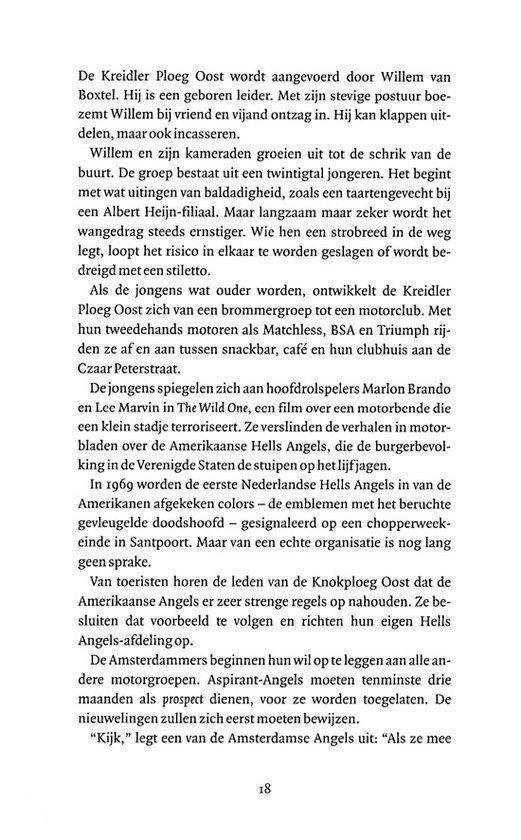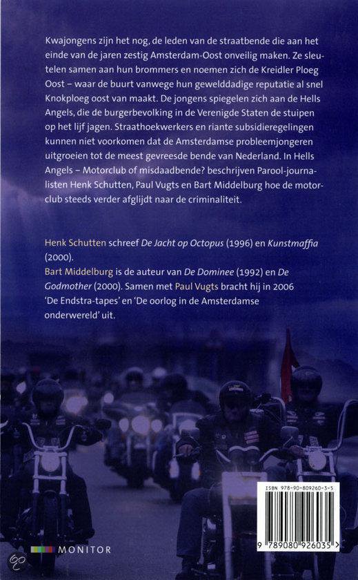 Kwajongens zijn het nog,de leden van de straatbende die aan het einde van de jaren zestig Amsterdam-Oost onveilig maken. Ze sleutelen samen aan hun brommers en noemen zich de Kreidler Ploeg Oost – waar de buurt vanwege hun gewelddadige reputatie al snel Knokploeg oost van maakt. De jongens spiegelen zich aan de Hells Angels, die de burgerbevolking in de Verenigde Staten de stuipen op het lijf jagen. Straathoekwerkers en riante subsidieregelingen kunnen niet voorkomen dat de Amsterdamse probleemjongeren uitgroeien tot de meest gevreesde bende van Nederland. In Hells Angels – Motorclub of misdaadbende? beschrijven Parool-journalisten Henk Schutten, Paul Vugts en Bart Middelburg hoe de motorclub steeds verder afglijdt naar de criminaliteit.