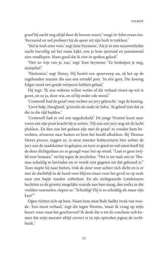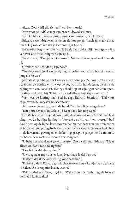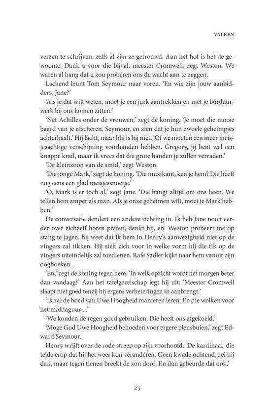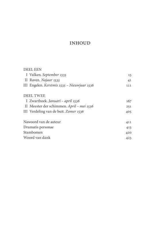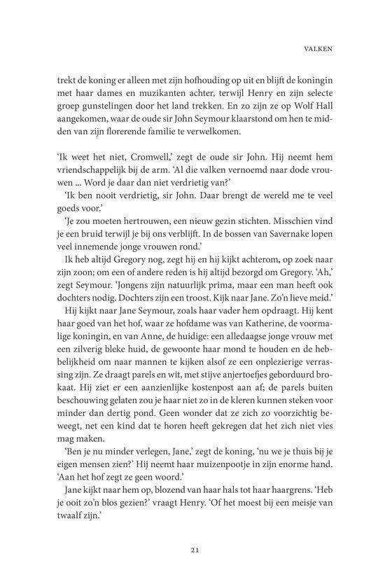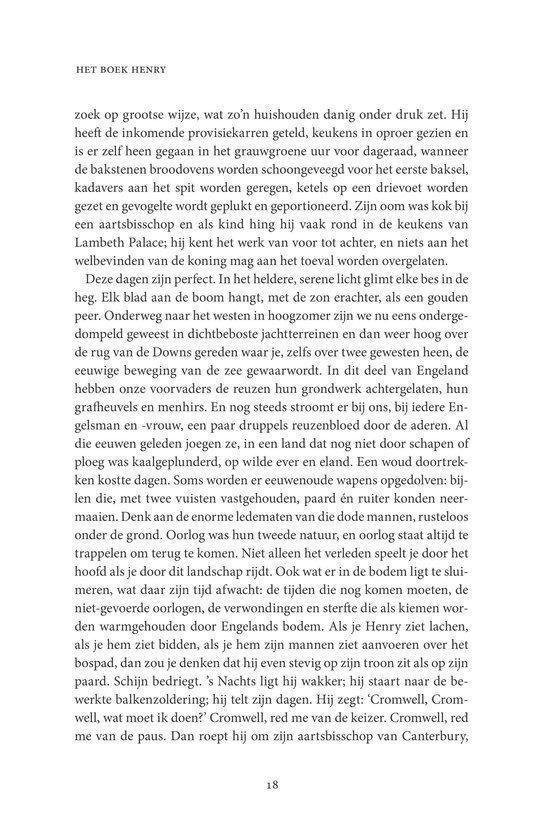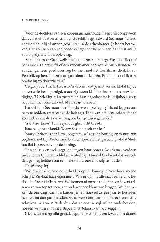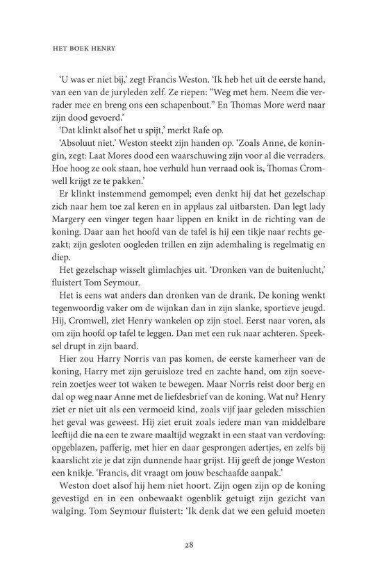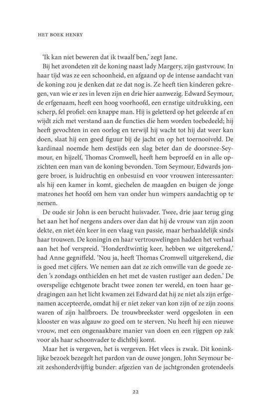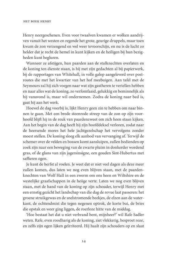 Het boek Henry, de opvolger van Wolf Hall, gaat hoofdzakelijk over de val van Anne Boleyn, de tweede vrouw van Henry VIII en moeder van de toekomstige koningin Elizabeth I. Na te hebben gebroken met de Kerk om met Anne te kunnen trouwen, lijkt Henry net zo snel zijn interesse in haar weer te verliezen als er almaar geen mannelijke troonopvolger komt. In 1534 heeft Anne een miskraam en in januari 1536 brengt ze een doodgeboren jongetje ter wereld. In mei van dat jaar wordt ze opgesloten in de Tower, op beschuldiging van overspel met meerdere mannen, en veroordeeld tot de dood door onthoofding. Hilary Mantel besloot het hoofdthema van het tweede boek te beperken tot de korte periode van Anne Boleyns neergang en de cruciale rol die Thomas Cromwell opnieuw speelt om Henry VIII ter wille te zijn. Cromwell is oppermachtig, maar is zelf de eerste die beseft hoezeer ook zijn macht afhangt van Henry’s humeuren, wensen en verlangens. Het resultaat is een bijzondere intense, onthutsende leeservaring, opnieuw briljant goed verteld door een van Engelands beste auteurs, Hilary Mantel. Na Het boek Henry verschijnt er nog één deel, De spiegel en het licht, over de laatste levensjaren van Thomas Cromwell, de zoon van een smid die een tijd lang de meest invloedrijke persoon was aan het Engelse hof. Maar ook hij moest ook eindelijk het hoofd buigen voor Henry VIII.