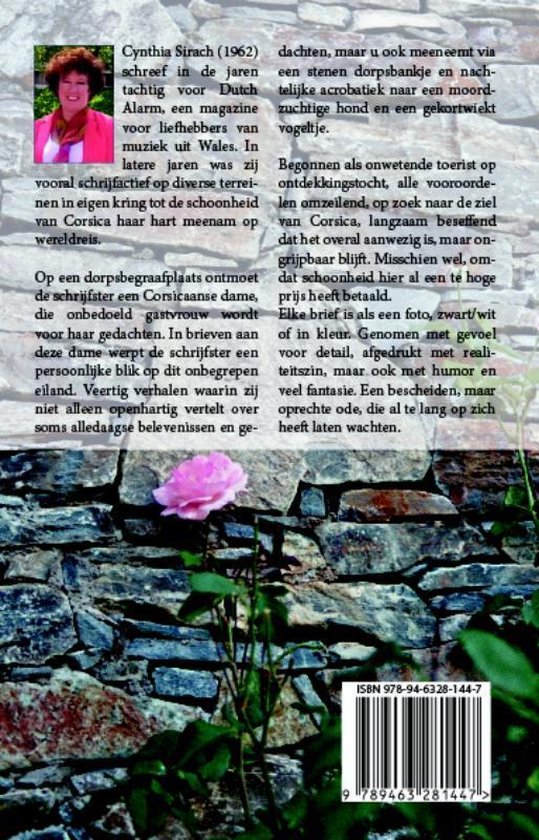 Op een dorpsbegraafplaats ontmoet de schrijfster een Corsicaanse dame, die onbedoeld gastvrouw wordt voor haar gedachten. In brieven aan deze dame werpt de schrijfster een persoonlijke blik op dit onbegrepen eiland. Veertig verhalen waarin zij niet alleen openhartig vertelt over soms alledaagse belevenissen en gedachten, maar u ook meeneemt via een stenen dorpsbankje en nachtelijke acrobatiek naar een moordzuchtige hond en een gekortwiekt vogeltje. Begonnen als onwetende toerist op ontdekkingstocht, alle vooroordelen omzeilend, op zoek naar de ziel van Corsica, langzaam beseffend dat het overal aanwezig is, maar ongrijpbaar blijft. Misschien wel, omdat schoonheid hier al een te hoge prijs heeft betaald. Elke brief is als een foto, zwart/wit of in kleur. Genomen met gevoel voor detail, afgedrukt met realiteitszin, maar ook met humor en veel fantasie. Een bescheiden, maar oprechte ode, die al te lang op zich heeft laten wachten.