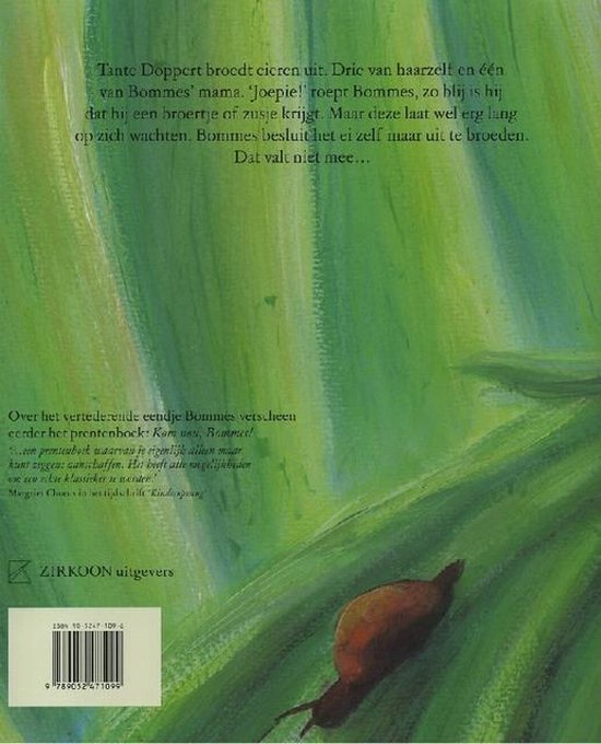 Het ei van BommesEen verhaal over wachten, dromen en moed Tante Doppert broedt een paar eieren uit — drie eigen eitjes én één van Bommes’ moeder. Als Bommes hoort dat er een broertje of zusje aankomt, kan hij zijn vreugde bijna niet bedwingen: “Joepie!” roept hij. Maar dat speciale ei laat heel lang op zich wachten… Gedreven door nieuwsgierigheid en verlangen besluit Bommes zelf het ei te helpen uitkomen. Dat blijkt echter minder eenvoudig dan gedacht. Hij leert wat geduld betekent, wat zorg nodig heeft, en hoe belangrijk hoop is als niets zeker lijkt. Een hartverwarmend prentenboek met lieve illustraties, dat jonge lezers laat meeleven met het lange wachten én de kleine daden van liefde. Het ei van Bommes is perfect voor het voorlezen — over broers, zussen, familie én kinderogen vol verwachting.