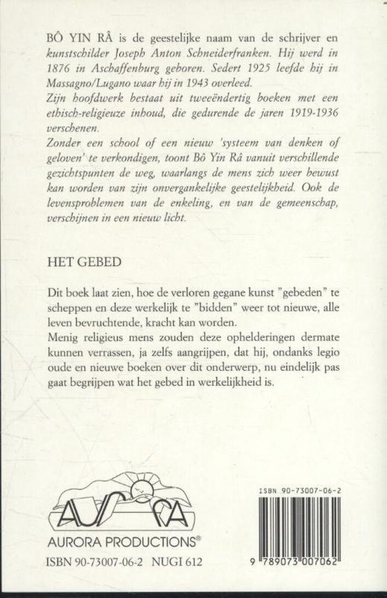 Het gebed Dit boek laat zien, hoe de verloren gegane kunst gebeden te scheppen en deze werkelijk te bidden weer tot nieuwe, alle leven bevruchtende, kracht kan worden. Menig religieus mens zouden deze ophelderingen dermate kunnen verrassen, ja zelfs aangrijpen, dat hij, ondanks legio oude en nieuwe boeken over dit onderwerp, nu eindelijk pas gaat begrijpen wat het gebed in werkelijkheid is. 136 pag. / Pb., 1996 / 18 x 12 cm. / Vertaling E. van Eeden