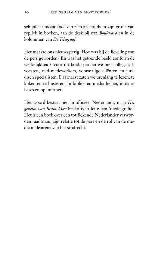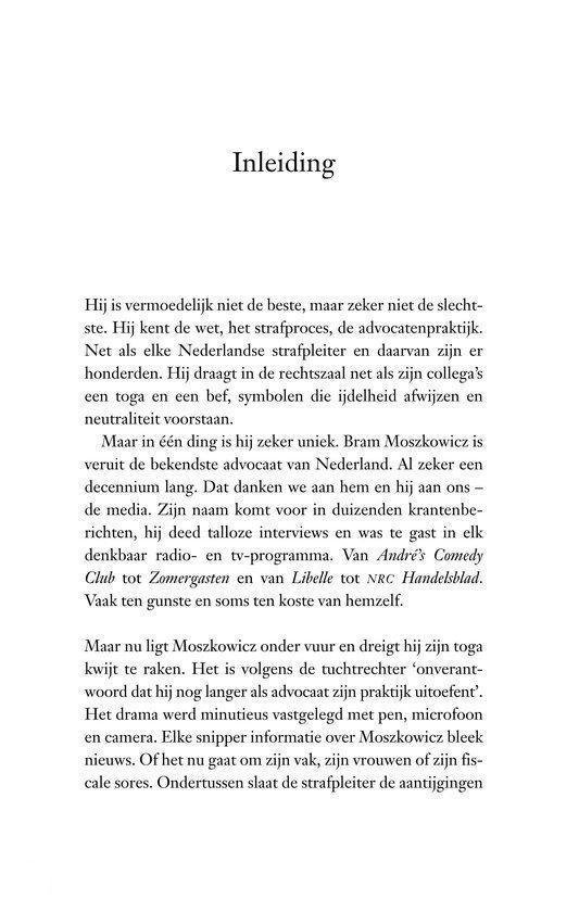 Hij was de stem van Holleeder, Bouterse en Endstra. Hij verdedigde Geert Wilders, nam het op voor Robin van Persie en stond Estelle Cruijff bij, in de rechtszaal én daarbuiten. Aan de desk bij RTL Boulevard, in de kolommen van De Telegraaf en aan tafel bij Pauw & Witteman kreeg Bram Moszkowicz zijn dagelijkse portie roem. De advocaat was bijkans bekender dan zijn glamoureuze clientèle. Voor velen is de strafpleiter, met zijn maatpakken en dure bolides, hét gezicht van de advocatuur. Een eloquent spreker, de beste in zijn vak. Iemand die juridische kennis etaleert met onweersproken spitsvondigheden.