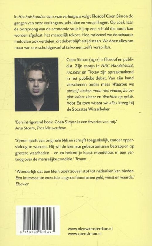 In ‘Het huishouden van onze verlangens’ volgt filosoof Coen Simon de gangen van onze verlangens, schulden en verspillingen. Op zoek naar de oorsprong van de economie stuit hij op een schuld die nooit kan worden afgelost: het menselijk tekort. Hoe rationeel we de schaarse middelen ook verdelen, dit debet blijft altijd staan. We doen alles om maar van ons schuldgevoel af te komen, zelfs verspillen. Het doel van de economie is dan ook nooit de nul op de eindbalans. Elke economie is volgens Simon een huishouden van onze verlangens, een spel met de dingen die we niet nodig hebben. Alleen dit spel kan ons afleiden van het gat in de zin van het bestaan, een gat dat vele malen groter is dan het gat in onze hand.