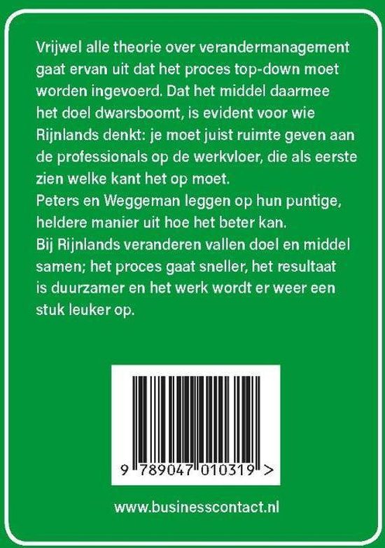 In ‘Het Rijnlands veranderboekje’ leggen veteranen Jaap Peters en Matthieu Weggeman op een puntige en heldere manier uit hoe veranderen beter kan. Want vrijwel alle theorie over verandermanagement gaat ervan uit dat het proces top-down moet worden ingevoerd. Dat het middel daarmee het doel dwarsboomt, is evident voor wie Rijnlands denkt: je moet juist ruimte geven aan de professionals op de werkvloer, die als eerste zien welke kant het op moet. Bij Rijnlands veranderen vallen doel en middel samen; het proces gaat sneller, het resultaat is duurzamer en het werk wordt er weer een stuk leuker op.