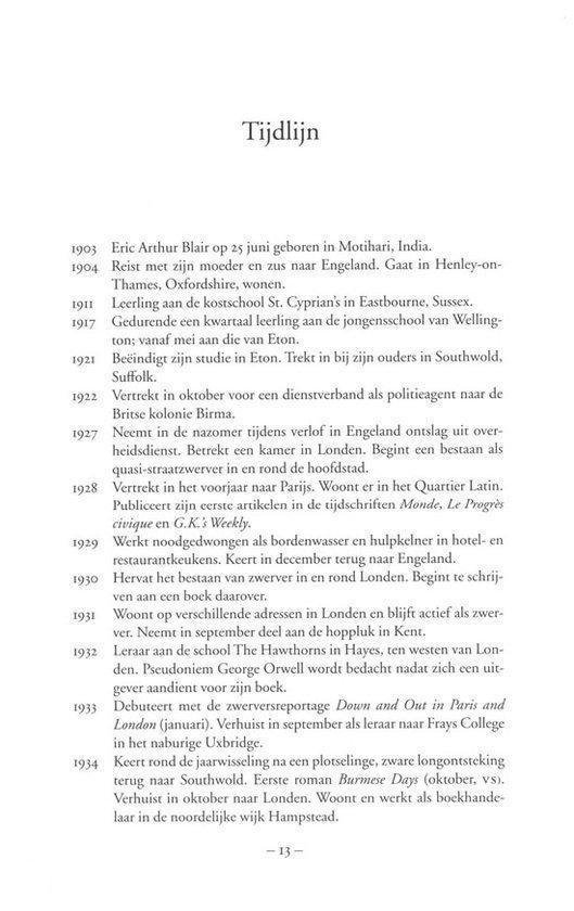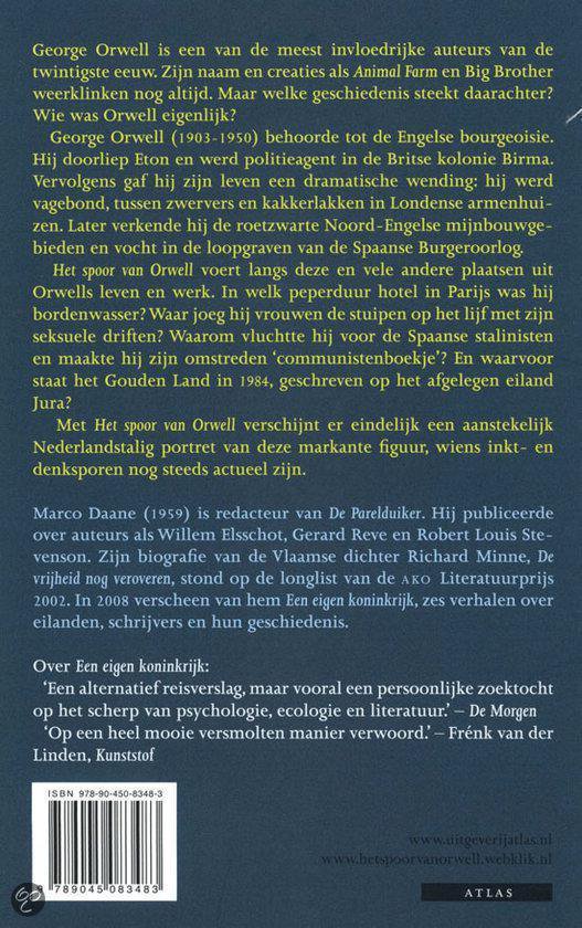 De naam George Orwell blijft opduiken in de actualiteit. Als geestelijk vader van Animal Farm en Big Brother is Orwell een van de meest invloedrijke auteurs van de afgelopen eeuw. Maar hoe werd hij dat? Wie was hij eigenlijk? George Orwell (1903-1950) behoorde tot de Engelse bourgeoisie, doorliep Eton en werd politieagent in de Britse kolonie Birma. Vervolgens gaf hij zijn leven een dramatische wending door vagebond te worden, tussen zwervers en kakkerlakken in Londense armenhuizen. Later bezocht hij de roetzwarte Noord-Engelse mijnbouwgebieden en vocht hij in de loopgraven van de Spaanse Burgeroorlog. Het spoor van Orwell voert langs deze en vele andere plaatsen waar Orwell leefde, werkte en over schreef. In welk peperduur Parijs hotel was hij bordenwasser? Waar joeg hij vrouwen de stuipen op het lijf met zijn seksuele driften? Waarom en hoe vluchtte hij voor de Spaanse stalinisten en maakte hij zijn omstreden communistenboekje? Heeft er een echte Animal Farm bestaan? En wat was het mysterieuze Gouden Land uit 1984, geschreven op het afgelegen eiland Jura? Met Het spoor van Orwell verschijnt er eindelijk een aanstekelijk Nederlandstalig portret van deze markante figuur, die zoveel inkt- en denksporen heeft nagelaten in onze cultuur en samenleving.