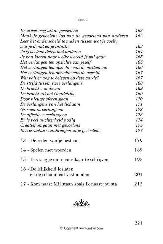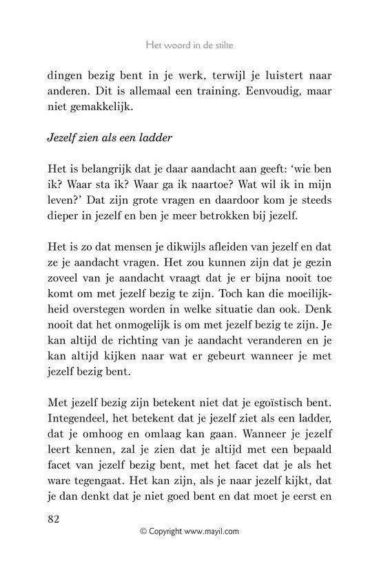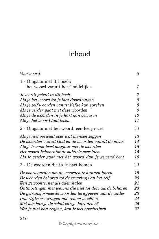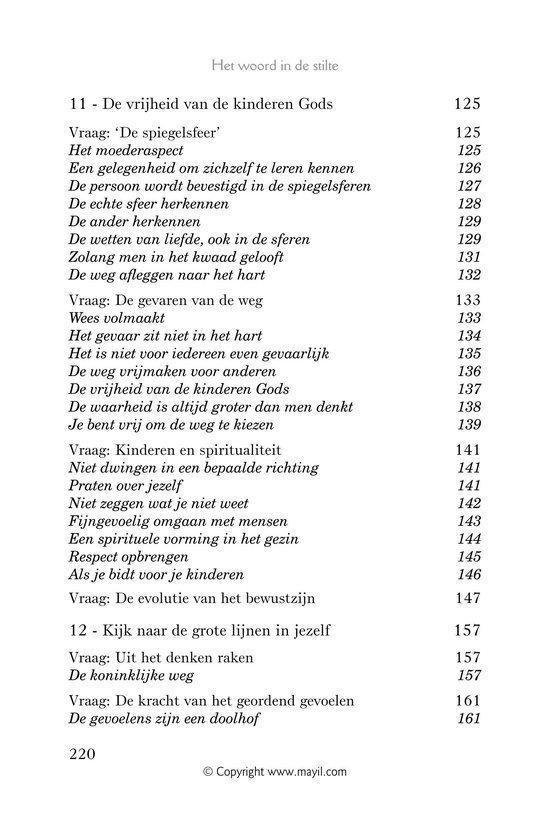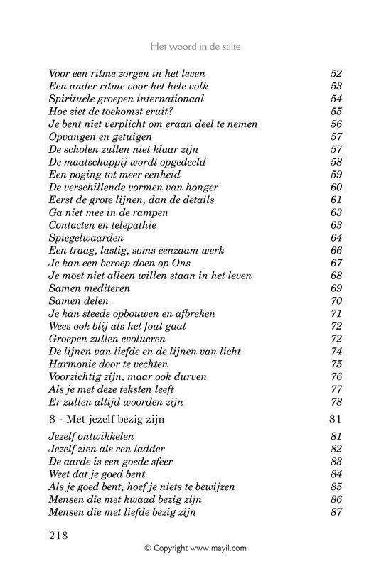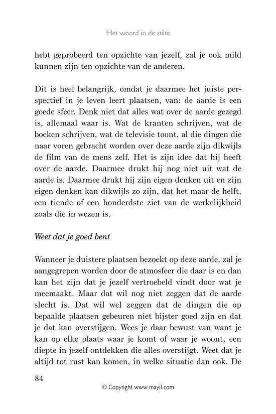 Meester Morya zegt: “Luister naar mooie dingen, schrijf mooie dingen, doe mooie dingen want het is de schoonheid die je zal leiden en het is de schoonheid die je bij je eigen ziel zal brengen. Je eigen ziel is goddelijk, ze is de schoonheid zelf.” “Dit boek gaat over het overweldigend belang om je eigen innerlijk aan het woord te laten, als een weg van vervolmaking en volmaaktheid.” Morya is meesterlijk in het beschrijven van de innerlijke realiteit van de dingen. In dit boek legt hij o.a. uit dat er veel meer achter woorden zit dan je op het eerste gezicht zou denken. Woorden zijn drager van energie, en deze energie is veel belangrijker en werkzamer dan de klank of de vorm van het woord zelf. Hij legt ook uit hoe je bewust met deze energie kan leren omgaan en werken, en hoe je ook met negatieve energieën en woorden kan omgaan. De “Morya Wijsheid” boeken maken deel uit van een reeks, maar kunnen zonder problemen elk op zich gelezen worden. Fragmenten uit elk boek en meer informatie over Morya vind je op www.morya.org . In “Het woord in de stilte” vind je de volgende hoofdstukken: Het woord vanuit het Goddelijke Omgaan met het woord: een leerproces De woorden die in je hart komen Poëzie De vlucht van de geest De nieuwe kinderen Kijk naar de grote lijnen op de wereld Met jezelf bezig zijn De stilte Emancipatie De vrijheid van de kinderen Gods Kijk naar de grote lijnen in jezelf De reden van je bestaan Spelen met woorden Ik vraag je om naar elkaar te schrijven De lelijkheid loslaten en de schoonheid vasthouden Kom naast Mij staan zoals Ik naast jou sta