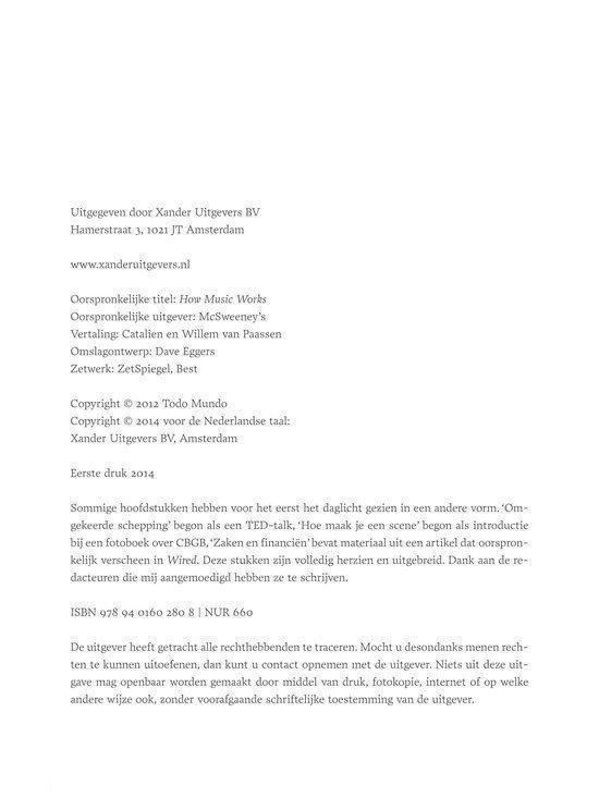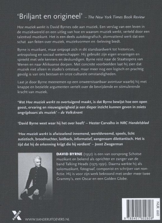 ‘Hoe muziek werkt’ is David Byrnes ode aan de kunstvorm waar hij al tientallen jaren over nadenkt. Het is een allesomvattend werk over muziek en alle elementen die daarop van invloed zijn, het is autobiografisch, maar biedt ook een schat aan feiten over muziek, muziekvormen en -beleving. Byrne is muzikant, maar ontpopt zich in dit standaardwerk tot historicus, antropoloog en sociaal wetenschapper. Hij gebruikt zijn eigen ervaringen en spreekt met vele kenners en deskundigen, hij reist naar de Opera van Wenen en naar Afrikaanse dorpen – als er maar muziek is – om te laten zien dat muziek niet iets is dat in een studio in elkaar wordt gezet, maar een logisch en prachtig gevolg van ons bestaan en van culturele omstandigheden.